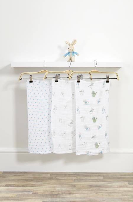 Krásná dárková sada s 3 ks mušelínových plenek a plyšovým zajíčkem Petrem. Plenky mají rozměr 60x60 cm a každá z nich má jiný potisk. Jsou 100% bavlněné a můžete je prát v pračce.
