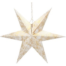 Hvězda vánoční šesticípáMateriál: Směs papíru a bavlnyBarva zlatá10LEDBarva světla: teplá bíláNapájení: 3xAAČasovač: 6/18 hPrůměr hvězdy: 60cmBaterie nejsou součástí balení