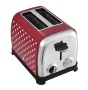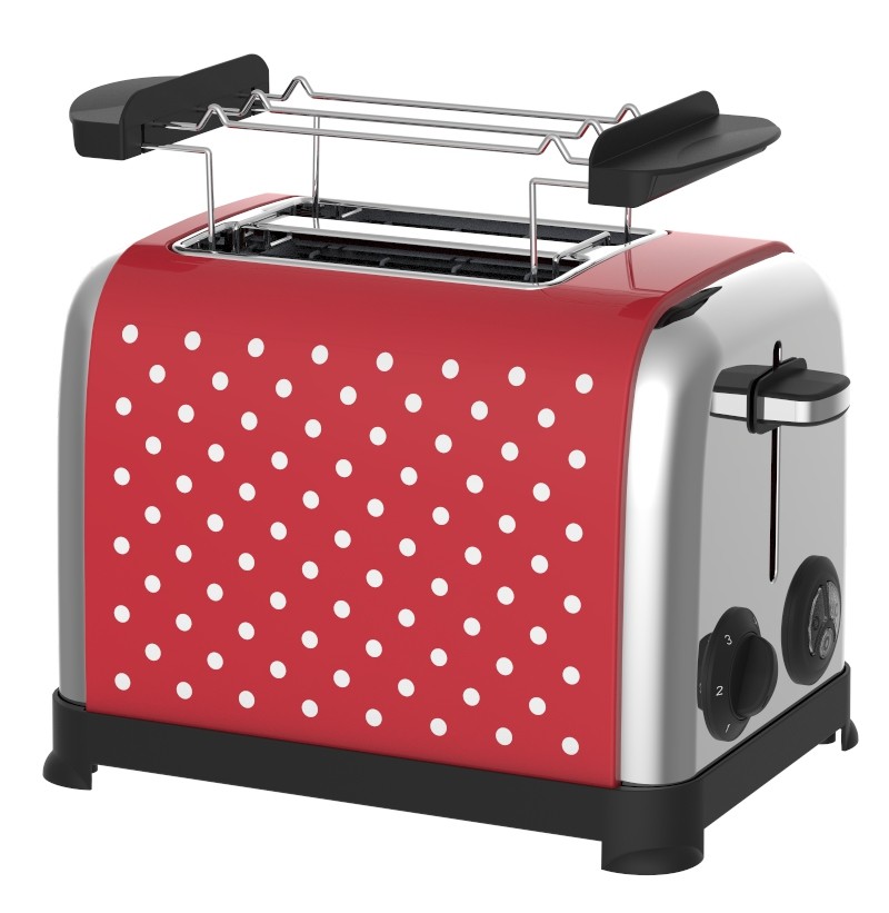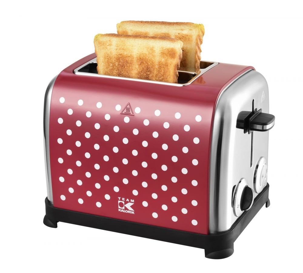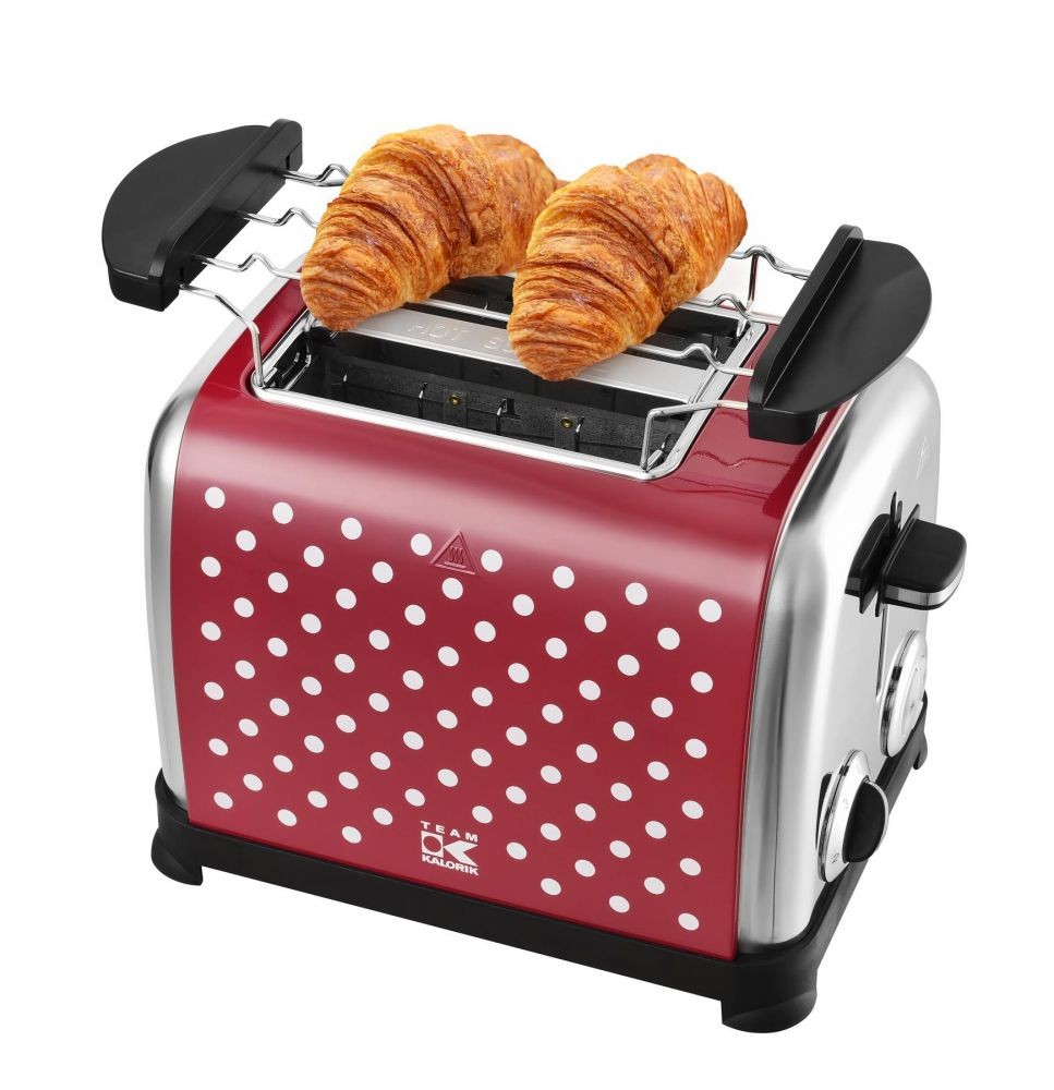 Kvalitní celonerezový topinkovač belgického výrobce Kalorik v retro designu s černými puntíky má široké 35 mm otvory pro vkládání pečiva.Doplněn je praktickým nástavcem na rozpékání pečiva a výsuvnou přihrádkou na drobky.