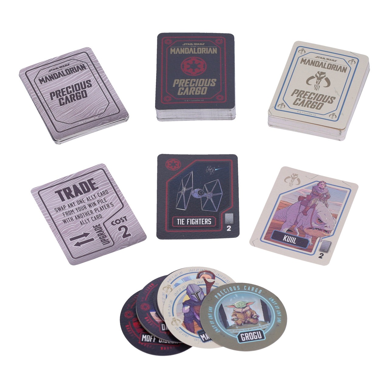 V detailně zpracované helmě známého lovce odměn z předaleké galaxie k Vám přichází jednoduchá a rychlá karetní hra, která prověří Vaši obratnost! Kdo bude mířit stejně přesně jako proslulý Mandalorian a získá nakonec tajemného a roztomilého Grogua? Nechejte se okouzlit atraktivními ilustracemi a zažijte výpravné dobrodružství za doprovodu svých oblíbených hrdinů a předmětů ze série Star Wars! Součástí balení je návod v anglickém jazyce. Hlavní vlastnosti:pro 2–6 hráčůherní doba cca 10 minutpraktické a atraktivní balení Pravidla hry: Před začátkem hry se hráči rozdělí do týmů podle příslušnosti k Mandalorianům, či Impériu a každému z nich připadne jeden vrhací disk s významnou postavou odpovídající strany. Doprostřed stolu se poté umístí disk s Groguem a kolem něj se v dostatečné vzdálenosti rozloží 15 náhodně vybraných karet, a to lícem dolů tak, aby nebyla vidět jejich hodnota. Hráči se poté střídají v hodech a snaží se, aby jejich disk dopadl na kartu, která odpovídá jejich příslušnosti. V případě úspěchu si hráč kartu vezme a ponechá, shora zamíchaného balíčku se přitom na vzniklé prázdné místo doplní další karta. Cílem snažení je získat karty o předem dohodnuté celkové hodnotě, do průběhu přitom mohou nepředvídatelně zasáhnout i karty speciálních akcí. Hráč, který drží karty o smluvené hodnotě, smí usilovat o vítězné získání Grogua. Pokouší se vrhat svůj disk tak, aby přistál na žetonu ve středu hrací plochy – to ovšem není vůbec snadné! Tak nechť Vás provází síla!