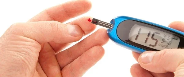 Reakce s glukózou - testovací proužek obsahuje chemickou látku, která reaguje s glukózou v krvi.