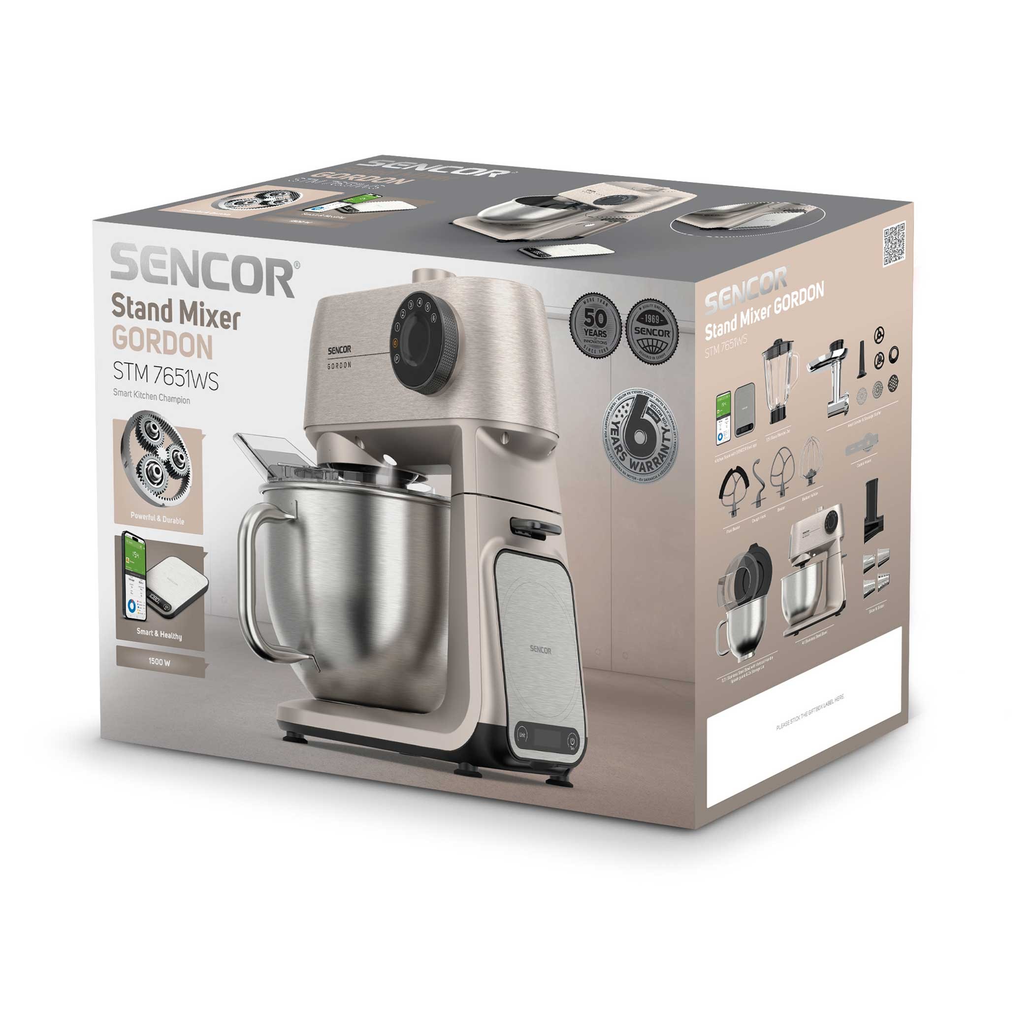 Kuchyňský robot Sencor STM 7651WS od značky Sencor kombinuje vysoký výkon, chytré technologie a robustní celokovové provedení. Je navržen a designován v České republice s ohledem na potřeby středoevropských domácností. Díky výkonnému motoru 1 500 W, planetární převodovce a širokému příslušenství zvládne hnětení, míchání, šlehání, mletí i strouhání. Celý popis