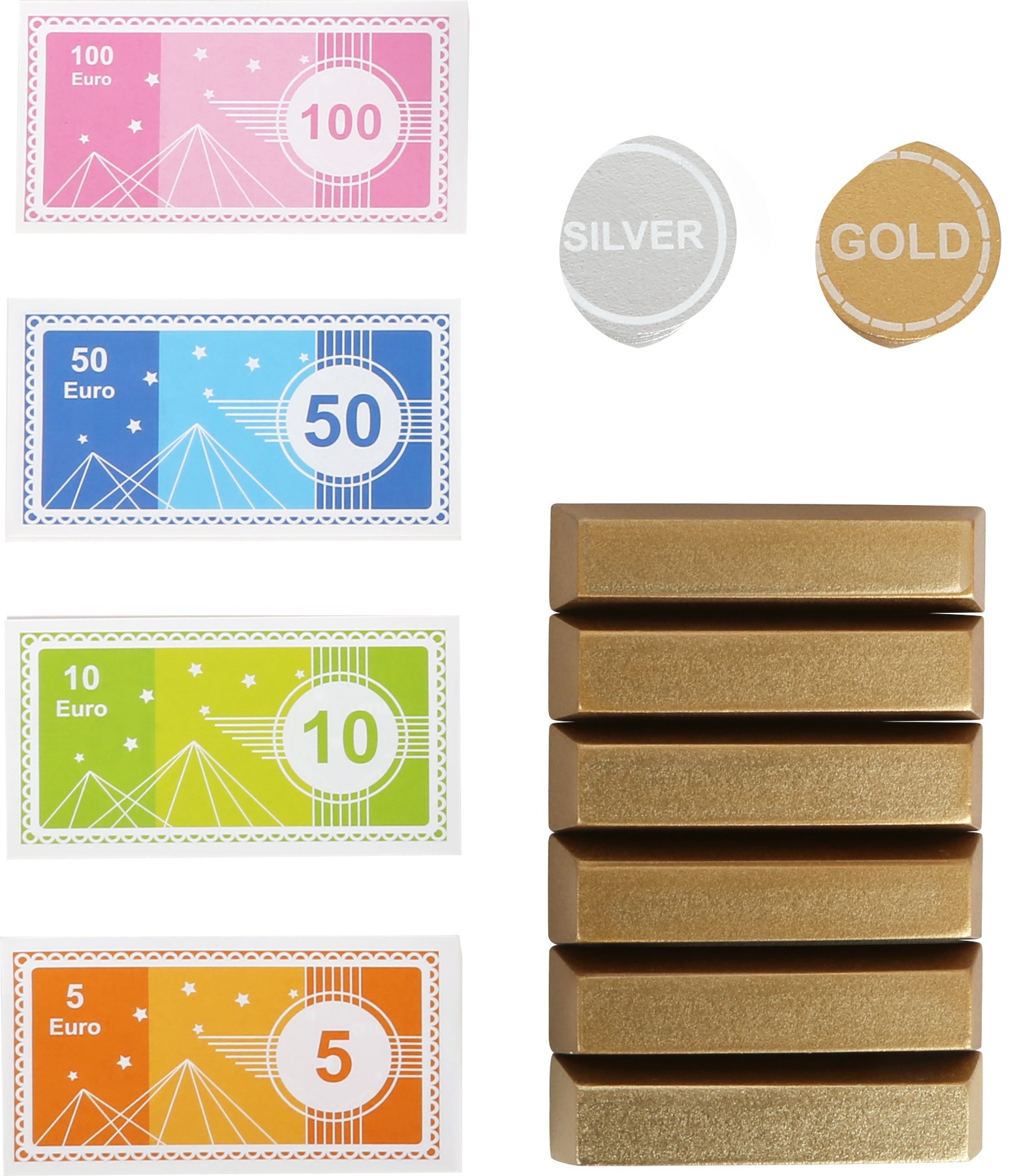 Bankéři a lupiči, pozor! Tento dřevěný sejf je opravdu něco! Při správné kombinaci se sejf otevře a odhalí svá tajemství – Euro bankovky, zlaté a stříbrné mince, ale i cihličky zlata (vyrobené ze dřeva). Otočný zámek vydává zvuk a tlačítka se dají mačkat. Hlavní vlastnosti: obsahuje 68 ks příslušenstvíotáčivý cvakající ciferník a mačkací tlačítka pro zadání kóduvhodné pro hraní rolí či na úschovu vlastních drobných pokladů