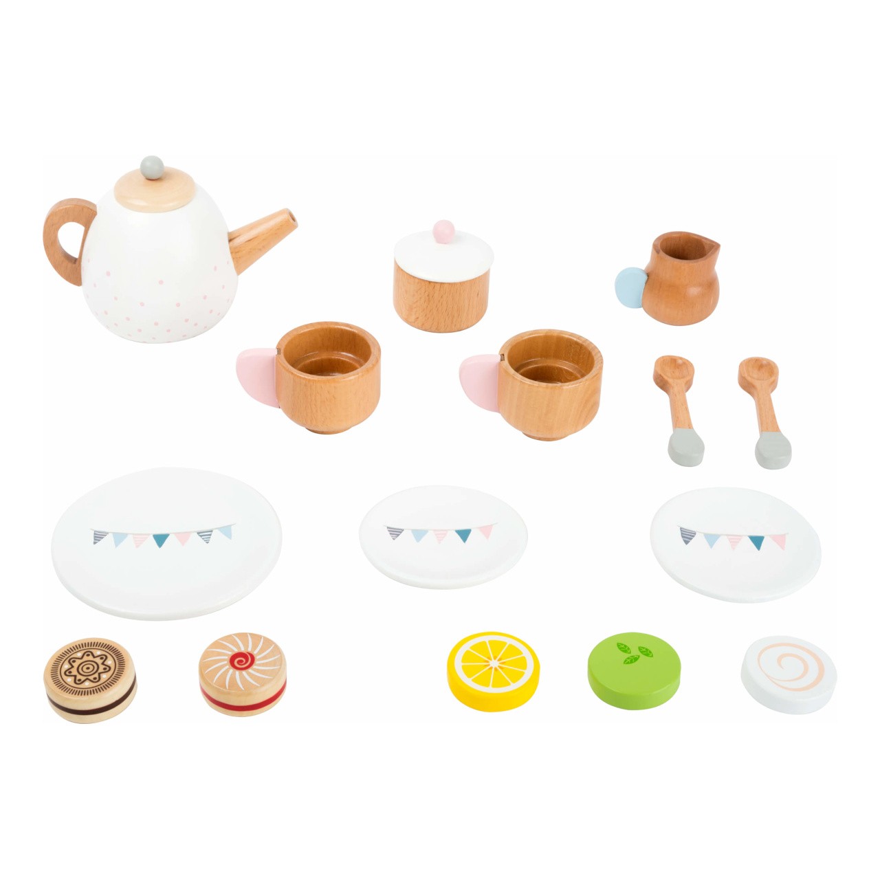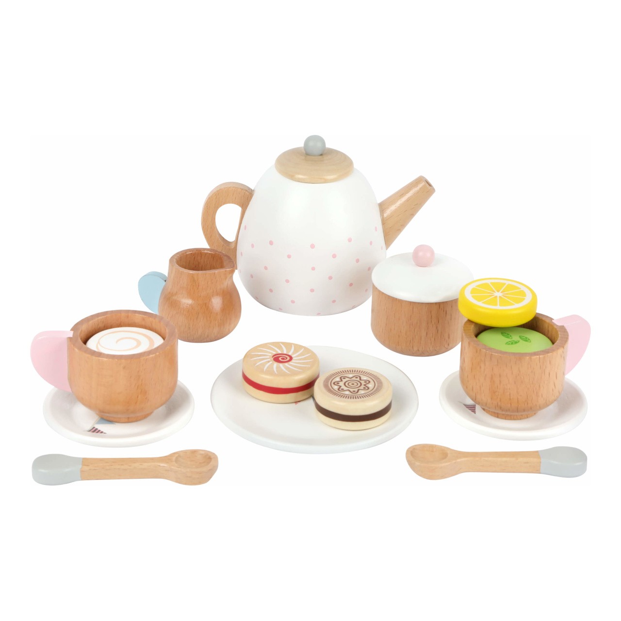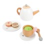 Máte chuť na lahodný čaj, nebo kávu se zákuskem? Zprostředkujte svým dětem možnost sehrát roli způsobných hostitelů, nechejte se obsloužit a vychutnejte si s nimi sladkou přestávku! S bohatou čajovou soupravou mohou děti rozvíjet fantazii, učit se pravidlům servisu a společenskému chování. Překvapí Vás pečlivým zpracováním z masivního dřeva, součásti jsou robustní a zvláště přizpůsobené dětským ručkám. Přírodní materiál dovedně přiznává a hravě kombinuje s jemnými pastelovými odstíny. Provedení klade důraz na detail, víčka konvičky i cukřenky jsou proto odnímatelná a hra může být ještě uvěřitelnější. Sadou můžete vhodně doplnit dětskou kuchyňku, stánek, nebo makety dezertů.   Hlavní vlastnosti:konvička s víčkem, 2 šálky s podšálky a lžičkami, 3 různé kapsle náplní, mlékovka, cukřenka s víčkem, talířek a 2 makety sušenekatraktivní a robustní provedení z masivního dřeva