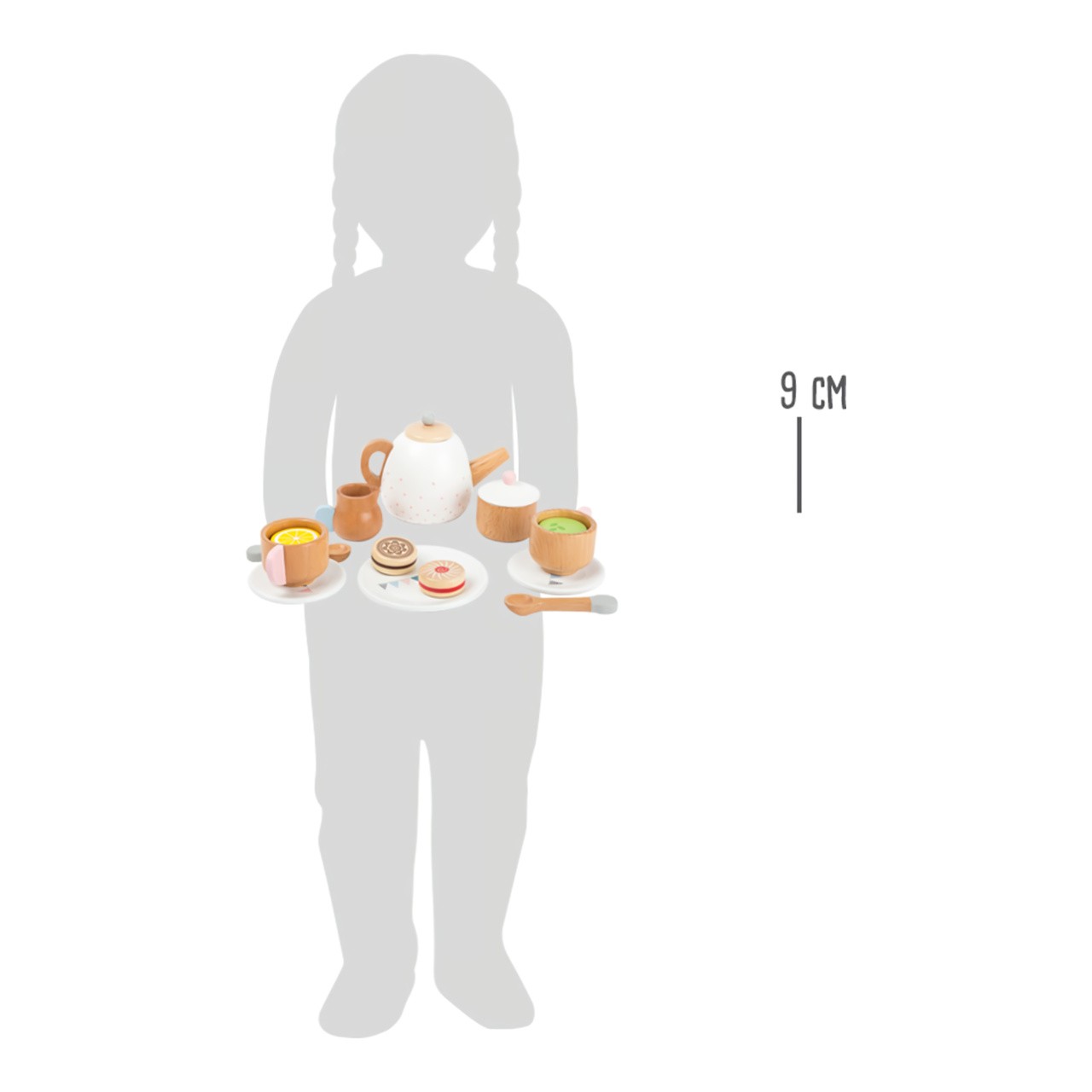 Rozměry konvičky: 3x8x9 cm Rozměr šálku: 7x5x4 cm Věk: 3+ Materiál: dřevo Počet dílů: 17 Celý popis