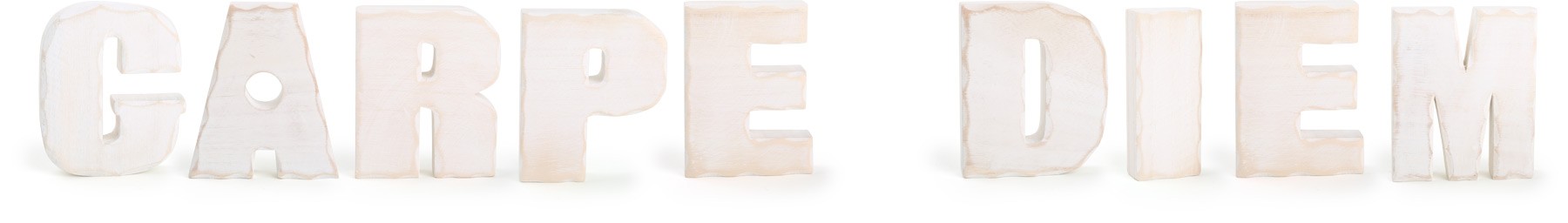 Dekorativní nápis "CARPE DIEM" je skvělým doplňkem do Vaší domácnosti. Dřevěná písmena jsou lazurovaná bílou barvou a lze je umístit dle přání. Hlavní vlastnosti: 9 dřevěných písmen