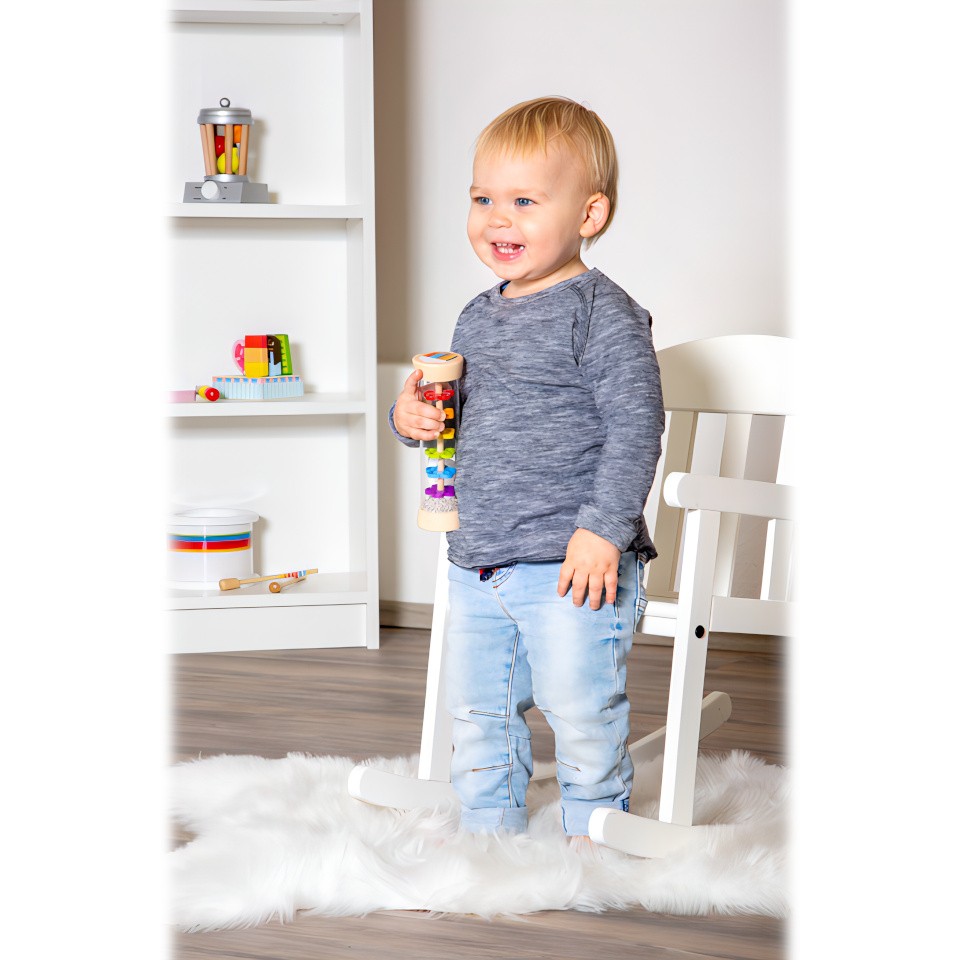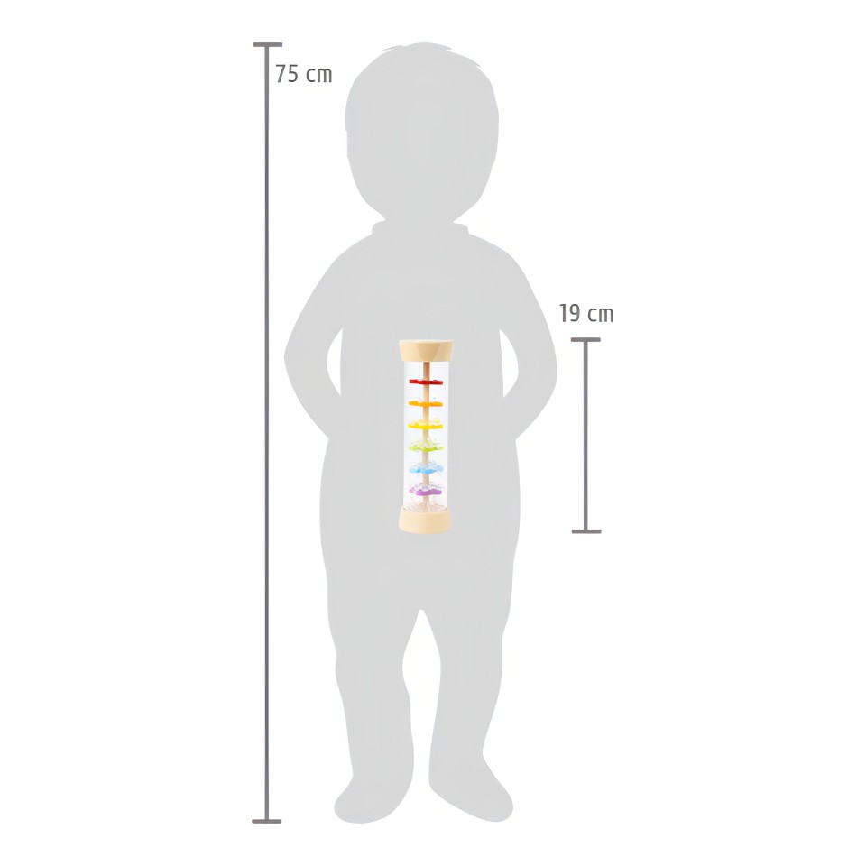 Tak přesně takhle zní déšť! S dešťovou holí můžete imitovat zvuky jemného deště. Můžete ji použít jako chrastítko, rytmickou hračku. Tělo hračky je průhledné, můžete tak pozorovat jak se kuličky pohybují přes zábrany ve tvaru květin. Hlavní vlastnosti: hračka trénuje akustické a vizuální vnímánívhodná také jako chastítko pro nemluvňatauklidňuje smysly dětí i dospělých