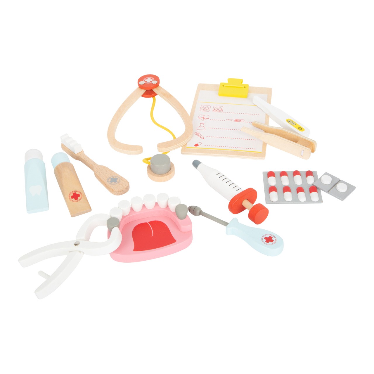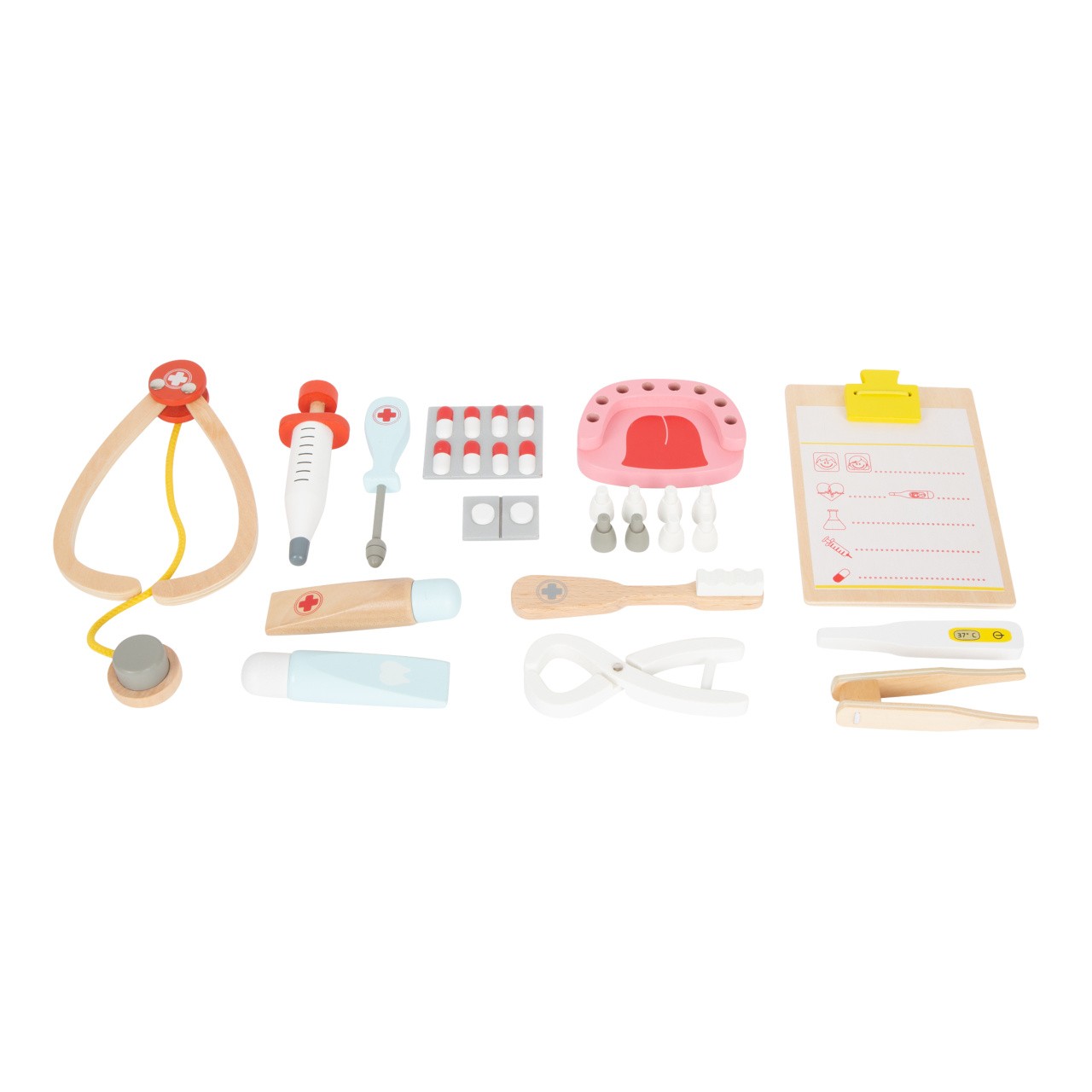 Zubní kazy nebudou mít šanci! Kufřík na zámek udělá dojem svými dřevěnými doplňky s pěkným designem. Dětská stříkačka, vrtačka, kartáček, sada zubů, zubní pasty a kleští, tato dřevěná dětská sada pro zubaře má vše! Dva šedé zuby děti naučí důležitosti zubní hygieny. S teploměrem, balzámem, pinzetou, tabletkami a poznámkovým blokem se kufřík hodí také ke hře na lékaře. Perfektní hračka, která děti připraví na první návštěvu u zubaře nebo lékaře. Děti si mohou zahrát na lékaře, tato hra podporuje kreativitu a dodá dětem odvahu. Všechny doplňky se pohodlně vejdou do kufříku. Otevřete si vlastní praxi! Hlavní vlastnosti Dřevěný kufřík na zámekTeploměr, balzám, injekční stříkačka, pinzeta, tablety, model zubůPěkný dětský design