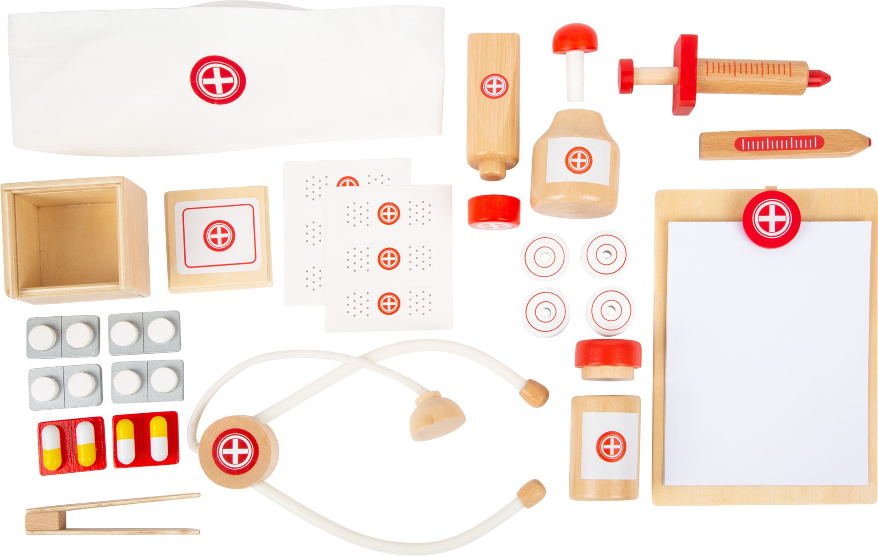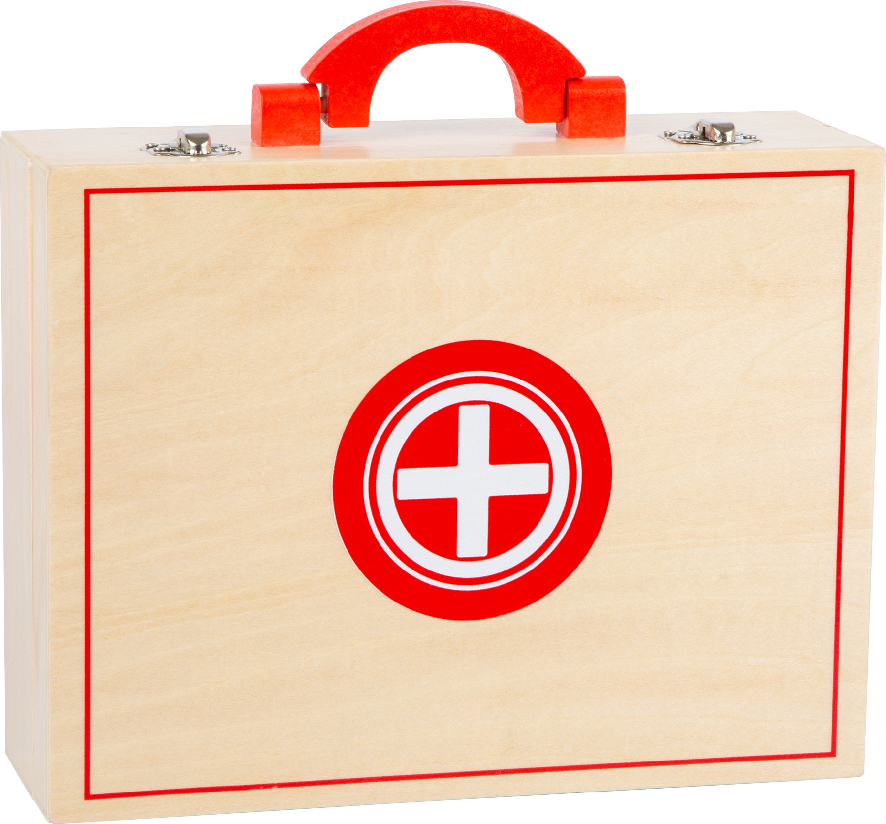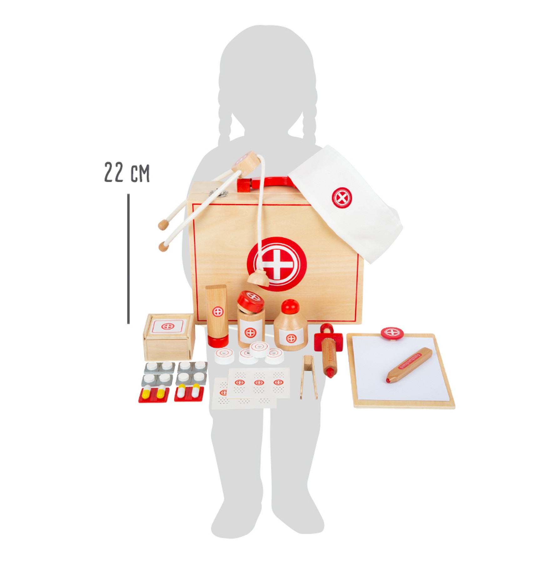 Lékaři už jsou na cestě! Mladí doktoři a doktorky se mohou s tímto dětským setem perfektně vybavit na cestu k pacientům. Kufřík obsahuje všechny důležité zdravotnické pomůcky, také vypadá pěkně – je plně dřevěný s klasickou bílo-červenou barvou. V kufříku najdete balení mastičky, láhev s tinkturou, stetoskop, injekční stříkačku, náplasti, tabletky, pinzetu, teploměr, papírový blok. Vše je samozřejmě určeno pouze pro hru a je dřevěné nebo papírové. Kufřík první pomoci pro plyšáky nebo panenky. Děti si mohou zahrát na lékaře, tato hra podporuje kreativitu a dodá dětem odvahu. Všechny doplňky se pohodlně vejdou do kufříku. Otevřete si vlastní praxi! Hlavní vlastnosti Dřevěný kufřík na zámkyLahvičky léků, stetoskop, injekční stříkačka, teploměr, pinzetaV klasické červeno-bílé barvě