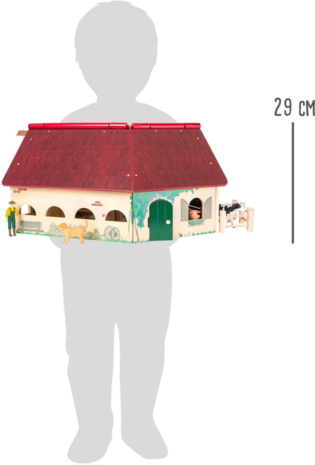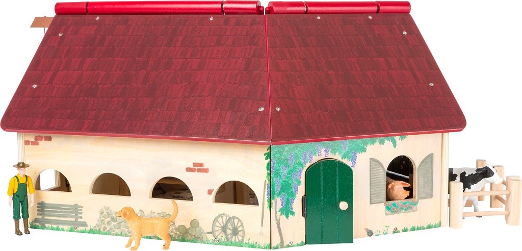 Život na farmě je tak skvělý! Tento velký statek ze 100% certifikovaného dřeva FSC® pro malé farmáře má vše, co by si mohli přát. Zvláštní kouzlo - stabilní dřevěná konstrukce farmy je uspořádána do nápadného úhlového tvaru a je vybavena sklopnou střechou, díky které je hraní velmi pohodlné. Zvířata jsou přátelská k dětem, rozzáří je. Strakatá kráva a růžové prase mají své místečko ve dvou boxech ve stáji, které jsou vybaveny posuvnými dveřmi. Farmářský pes má oči otevřené a pomáhá farmáři udržet vše v chodu. Farmář pohyblivou kladkou stále přidává nové balíky sena a slámy. O všechna zvířata je dobře postaráno. Podrobný design farmy podporuje realistickou hru - fantazii se meze nekladou. Dělené dveře farmy nabízejí tolik prostoru, že traktor může snadno projet a zaparkovat. Pro malé objevitele je kolem nádvoří mnoho jemně malovaných detailů, jako jsou květiny, lavička, konev, ptačí hnízdo a dokonce i myš. Skoro jako na skutečné farmě! Hlavní vlastnosti: rozvíjí motoriku dětí a komunikační dovednostihravý design podporuje zvídavost a lásku k příroděvyrobeno z 100% FSC dřeva Značka a certifikát FSC® (Forest Stewardship Council) zaručuje, že dřevo, ze kterého byl produkt vyroben, nebylo vytěženo nelegálně a pochází z lesů obhospodařovaných šetrným či přírodě blízkým způsobem, ve kterém jsou dodržovány přísné environmentální a sociální požadavky. Značka FSC® na výrobku znamená, že svým nákupem pomáháte chránit lesy a podporujete šetrné, odpovědné či přírodě blízké hospodaření, díky kterému jsou naše lesy stabilnější, zdravější, mají přirozenou druhovou skladbu a lépe odolávají negativním následkům klimatických změn.