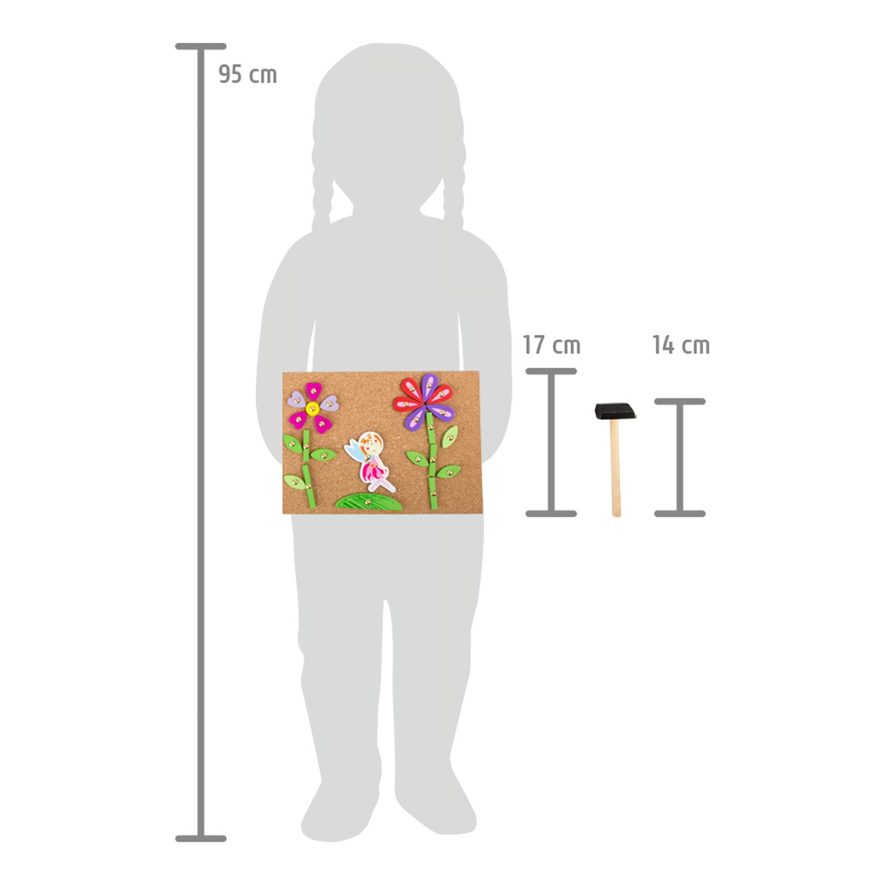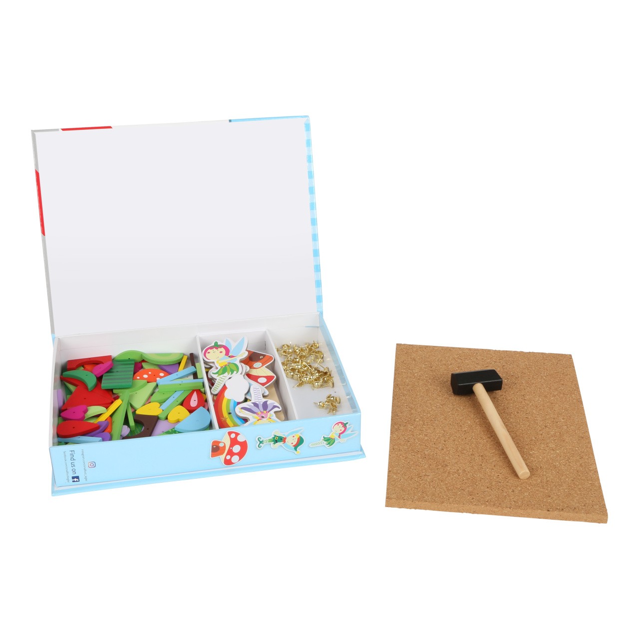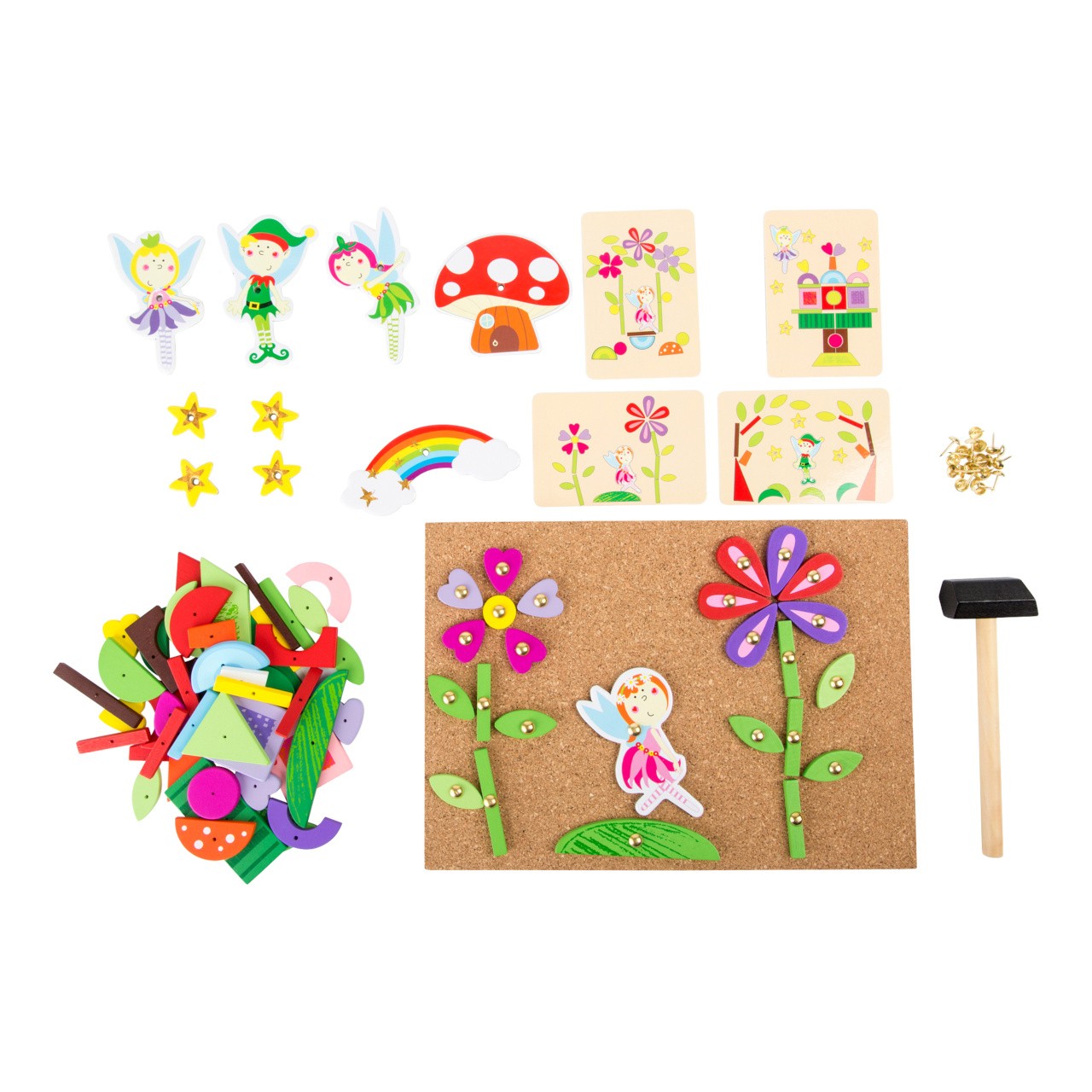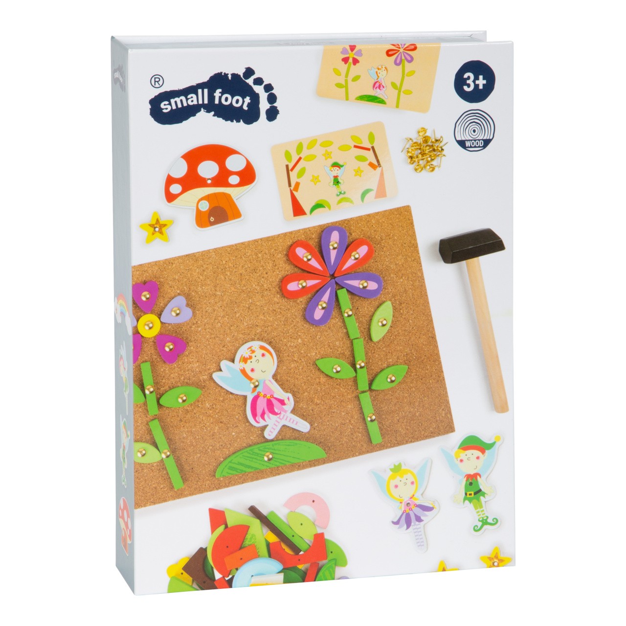 S touto hrou si může každé dítě vyrobit svůj vlastní nástěnný obrázek s motivem víl. Dřevěné a kartonové dílky skládačky mají předvrtané otvory, malé hřebíčky lze snadno zatlouct do korkové desky dřevěným kladívkem. Balení obsahuje také čtyři oboustranně potištěné karty s návrhy motivů.  Hlavní vlastnosti: podporuje kreativitu a koncentracipodporuje jemnou motorikupraktický úložný box