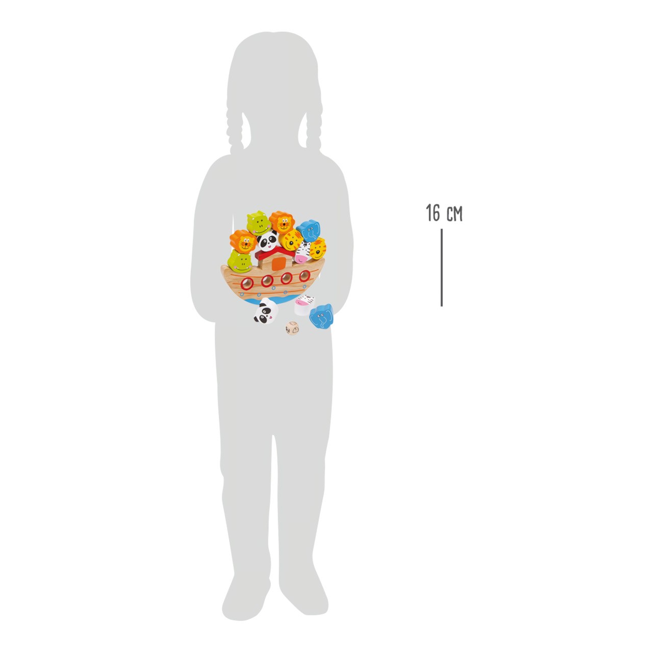 Při této hře musí být na sebe zvířata stavěna tak, aby archa nebyla vyvedena z rovnováhy a pasažéři nespadli dolů. Krásná hra na zkoušku šikovnosti z barevně lakovaného dřeva, pro trénink jemné motoriky a trpělivosti. Malá kostka určuje symboly, které zvířátko má být postaveno na archu. Lze však hrát i bez kostky, aby se tak snížila obtížnost hry. Hlavní vlastnosti: dětská dovednostní hra ze dřeva pro celou rodinu12 zvířat, archa a hrací kostkavysoce kvalitní zpracováníprocvičuje soustředění, jemnou motoriku a zručnost