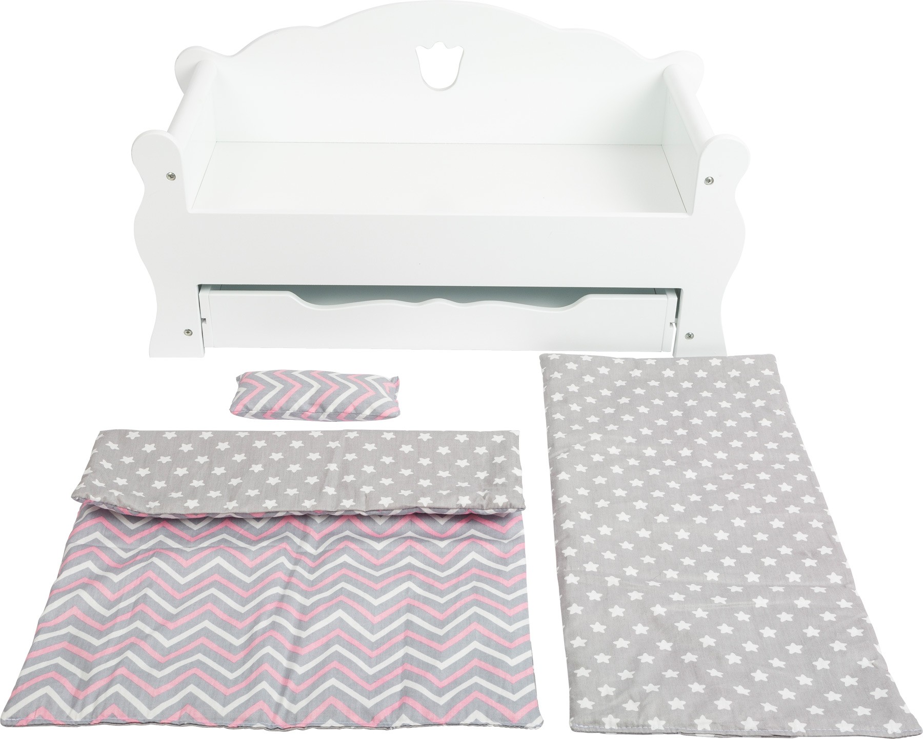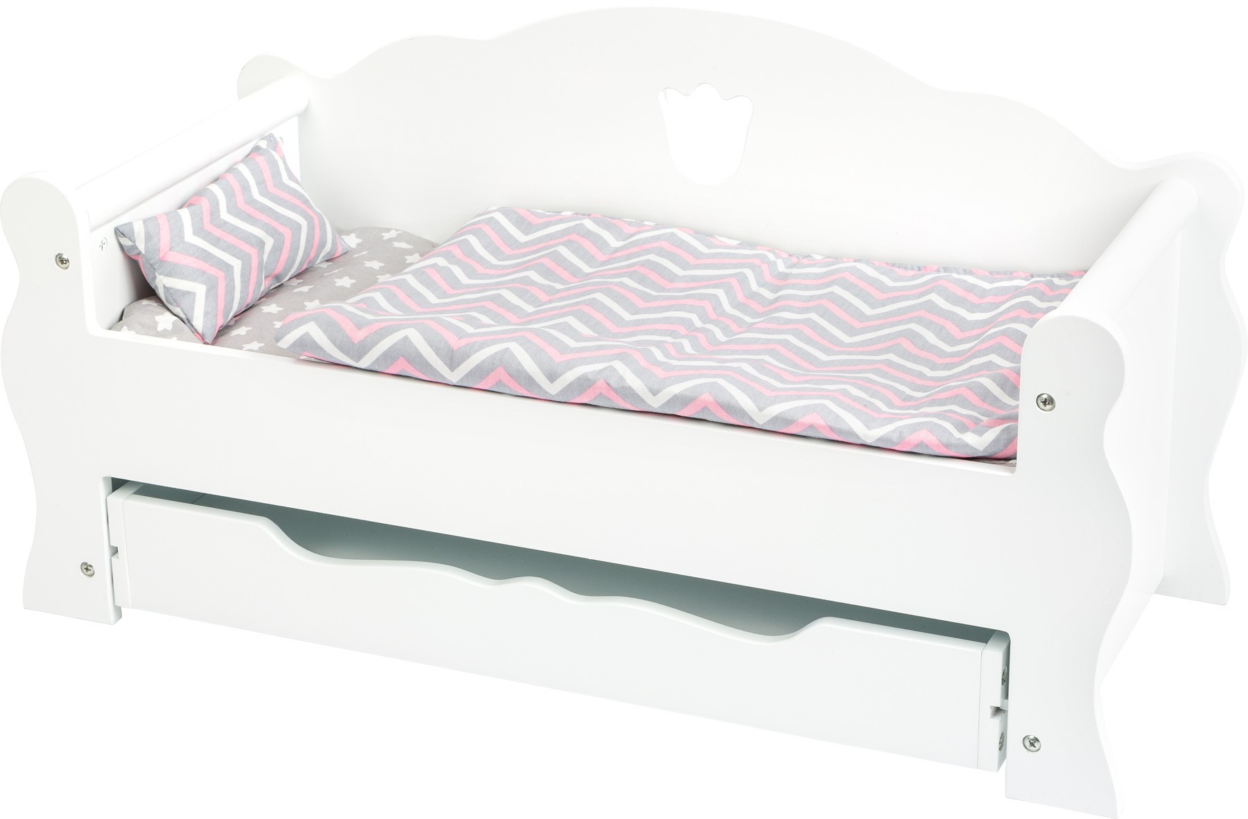 Tuto elegantní postel lze v mžiku proměnit na komfortní pohovku, a tak si najde své využití ve dne i v noci. Do praktického úložného prostoru schováme peřinku a polštář nebo jej využijeme jako místo pro dalšího spáče. Panenky či plyšáci jistě ocení možnost se po náročném dni natáhnout a odpočinout si. Hlavní vlastnosti: vhodné pro panenky do 45 cmpraktický výsuvný úložný prostor pod postelísoučástí matrace, peřinka a polštář
