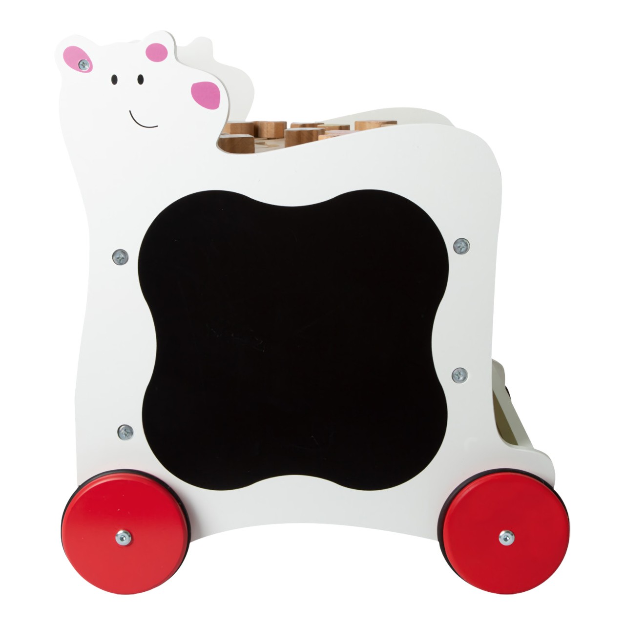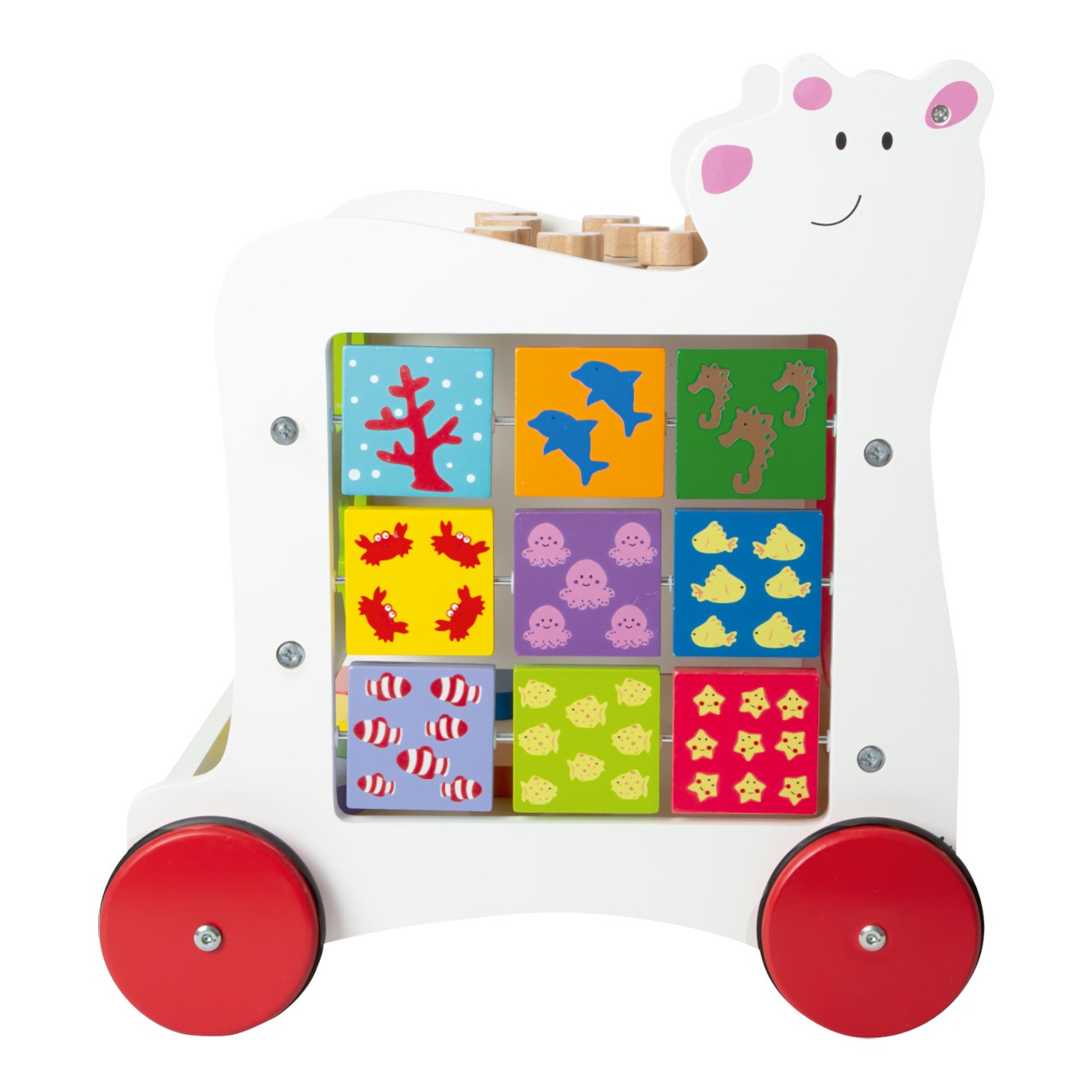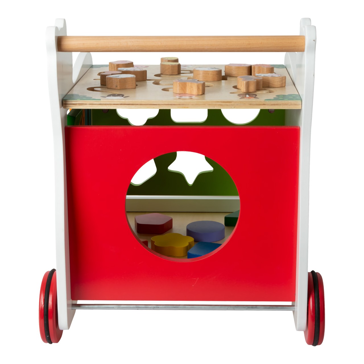 S medvídkem vždy po boku! Multifunkční chodítko dětem nabízí oporu při objevování světa a procvičování různých dovedností. S jeho pomocí lze rozvíjet hrubou i jemnou motoriku, rozpoznávání barev, tvarů a díky tabulce i kreslení a psaní. S motivem medvídka se hravě stane užitečným kamarádem na cestách dětským pokojíčkem. Nabízí praktický úložný prostor, je stabilní a pogumovaná kolečka zajišťují kultivovaný tichý chod na všech druzích povrchů. Chodítko je zhotoveno z kombinace silné a odolné překližky s masivním dřevem. Výrobek vyžaduje montáž, dodáváno s obrázkovým návodem k sestavení. Hlavní vlastnosti: multifunkční chodítko a 6 dílků vkládačkyvkládačka, bludiště, otáčivé kostky a tabulka pro kreslení křídoupraktický úložný prostortichý chododolné dřevěné provedení