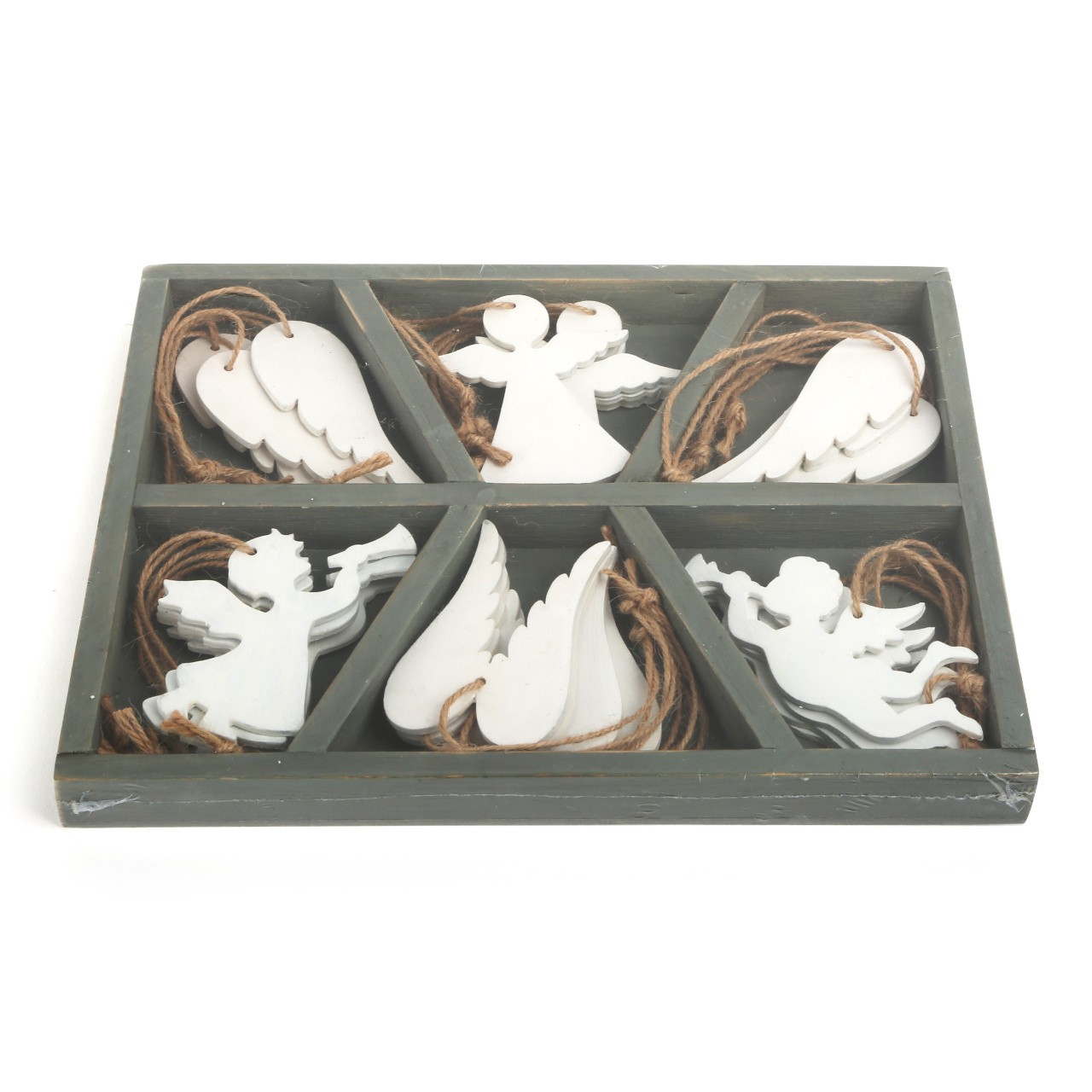 Krásná sada 18 ks vánočních ozdob v bílé barvě s motivem andělů a andělských křídel. Baleno v praktické dřevěné krabičce. Hlavní vlastnosti: uloženy v praktické dřevěné krabičce6 různých motivů