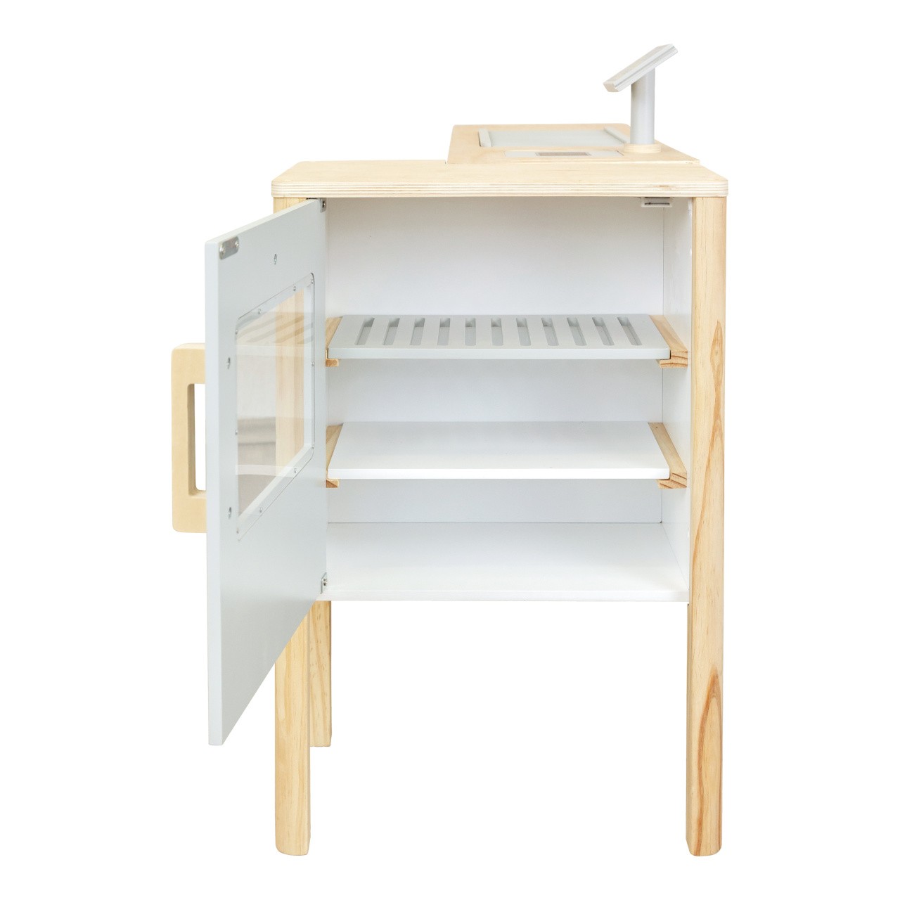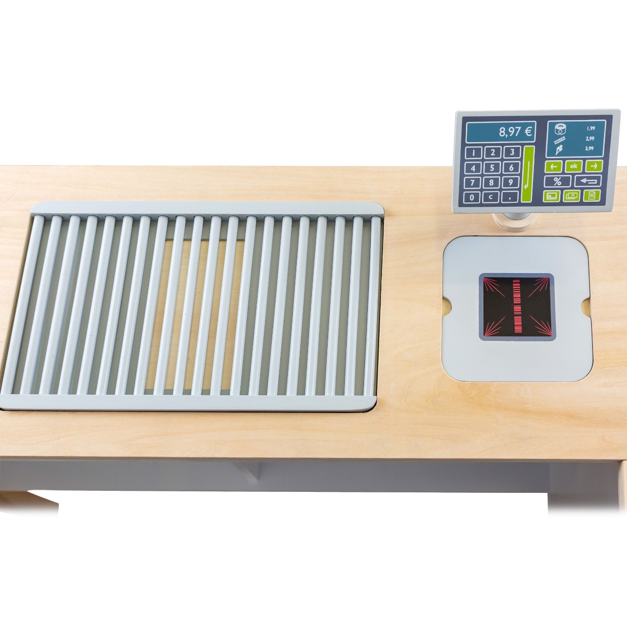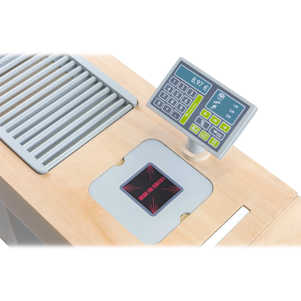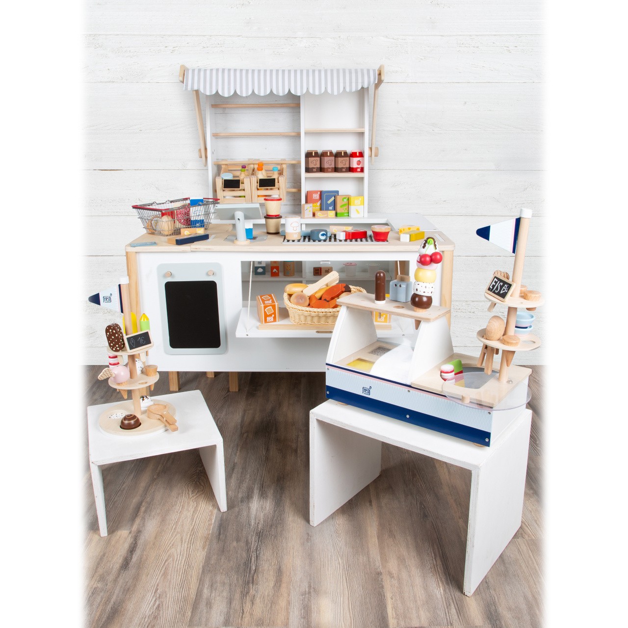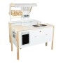 Prodejní stánek, kiosek, nebo bufet? Velký stánek v moderním skandinávském designu je modulární a multifunkční, skládá se z mnoha částí, které můžete přestavět během pár okamžiků a uspořádat i s ohledem k volnému prostoru u Vás doma. Variabilní herní prvky lze využít několika způsoby, pokladnu přestavěte na dřez, varnou desku na grill, z trouby vytvořte lednici. Ve výbavě dále naleznete váhu, výklopné police, popisovací tabule a také kávovar i úložné prostory se 2 bedýnkami. Markýza malého pultu se dá sklopit pro úsporu místa (její potah se může barevně lišit). Stánek nabízí dostatek prostoru pro hru více dětí najednou. Imitováním všedních situací se děti naučí jaké to je být prodejcem, zákazníkem, jaké je to vařit nebo jednat s lidmi. Výrobek vyžaduje montáž, dodáváno s obrázkovým návodem k sestavení.   Hlavní vlastnosti:multifunkční, různorodé využitímodulární konstrukce s variabilním vybavenímrozvíjí komunikační a sociální dovednosti dětí