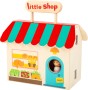 Pojďme nakupovat! Tento kompaktní obchůdek v dřevěném kufříku má šikovný zámek a najdete v něm zmrzlinový stánek, slunečník, několik kusů ovoce a zeleniny, pokladnu, váhu, reklamní tabuli a postavičku prodavačky. Hračku lze jednoduše přenášet a děti si tak mohou hrát i na cestách. Hlavní vlastnosti: obsahuje 15 ks příslušenstvípestrobarevné dřevěné provedeníkompaktní, přenosný kufříkpodporuje hraní rolí a představivost
