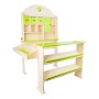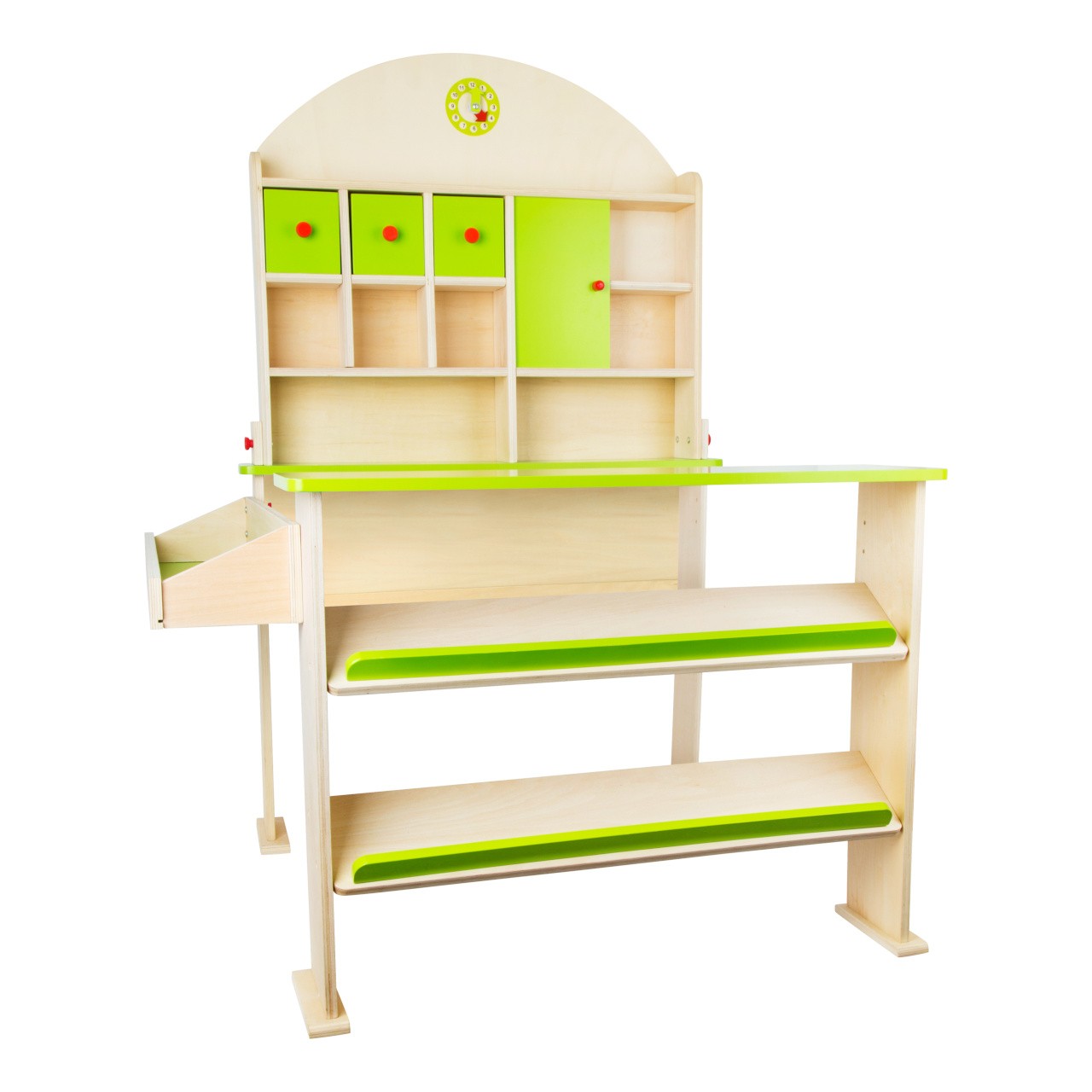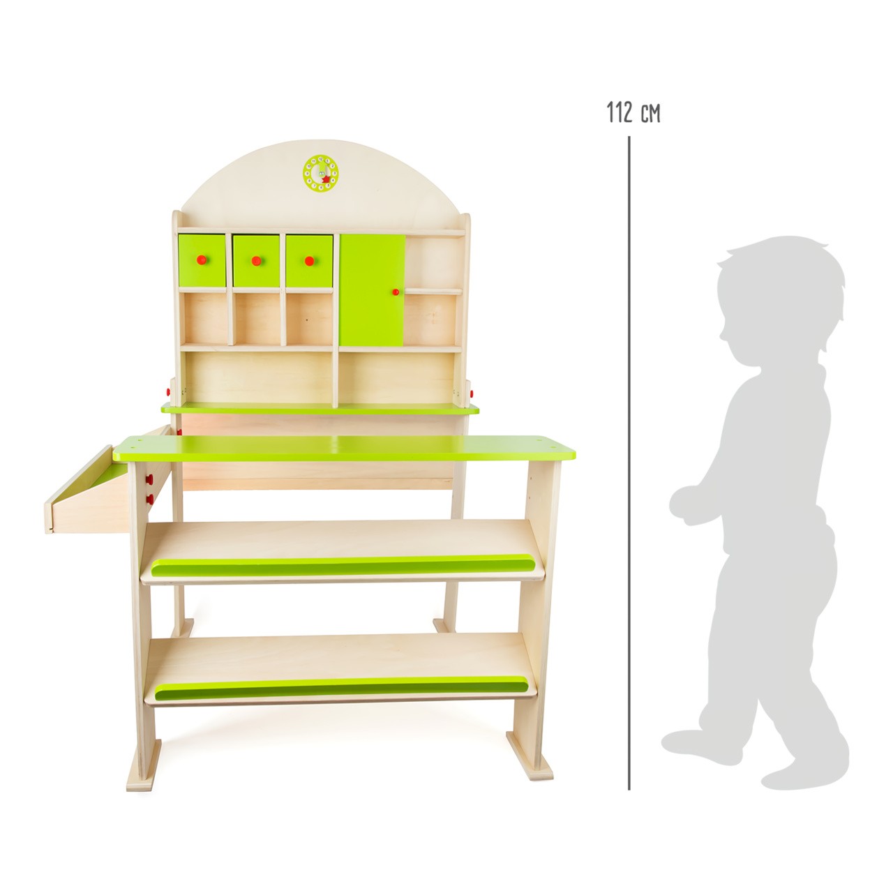 Podpořte své děti v poznávání společenských zvyklostí a rozvíjení komunikačních i početních dovedností pomocí moderního prodejního stánku. Jeho základem je prostorný pult, na který lze pohodlně umístit řadu doplňkového příslušenství, například pokladnu, váhu a krájecí prkénka. Šikmé policové díly jsou zvlášť vhodné k ukládání rozmanitých bedýnek. Pro jednotlivé makety a zboží lze využít další samostatnou polici. Zadní stěna obchodu nabízí několik různých odkládacích ploch a skříněk opatřených funkčními dvířky. Její štít navíc zdobí jednoduché hodiny, na nichž lze vyznačit otevírací dobu. Všechny součásti jsou vyrobeny z velmi odolné překližky a díky praktické, rozebiratelné konstrukci využívající robustní křídlové matice lze stánek snadno uklidit tak, aby šetřil místem. Výrobek vyžaduje montáž, dodáváno s obrázkovým návodem k sestavení.   Hlavní vlastnosti:velké množství rozmanitých úložných prostor4 dílná, snadno rozebiratelná konstrukcerobustní a odolné dřevěné provedení