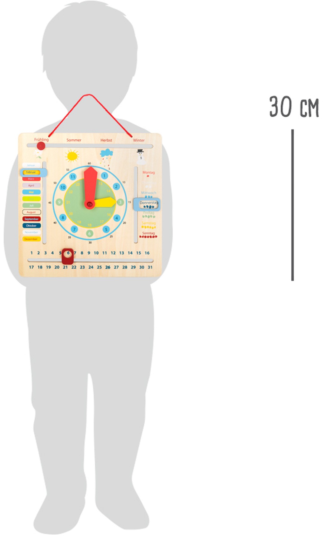 Přehledný dřevěný kalendář pro hravé naučení hodin dnů v týdnu, měsíců a ročních období.Názvy jsou v němčině. Hlavní vlastnosti: edukativní prvek vhodný do každého dětského pokojevyrobeno ze 100% FSC dřeva Značka a certifikát FSC® (Forest Stewardship Council) zaručuje, že dřevo, ze kterého byl produkt vyroben, nebylo vytěženo nelegálně a pochází z lesů obhospodařovaných šetrným či přírodě blízkým způsobem, ve kterém jsou dodržovány přísné environmentální a sociální požadavky. Značka FSC® na výrobku znamená, že svým nákupem pomáháte chránit lesy a podporujete šetrné, odpovědné či přírodě blízké hospodaření, díky kterému jsou naše lesy stabilnější, zdravější, mají přirozenou druhovou skladbu a lépe odolávají negativním následkům klimatických změn.