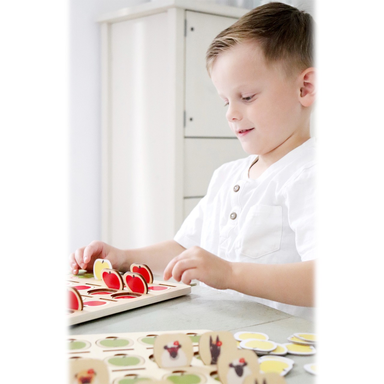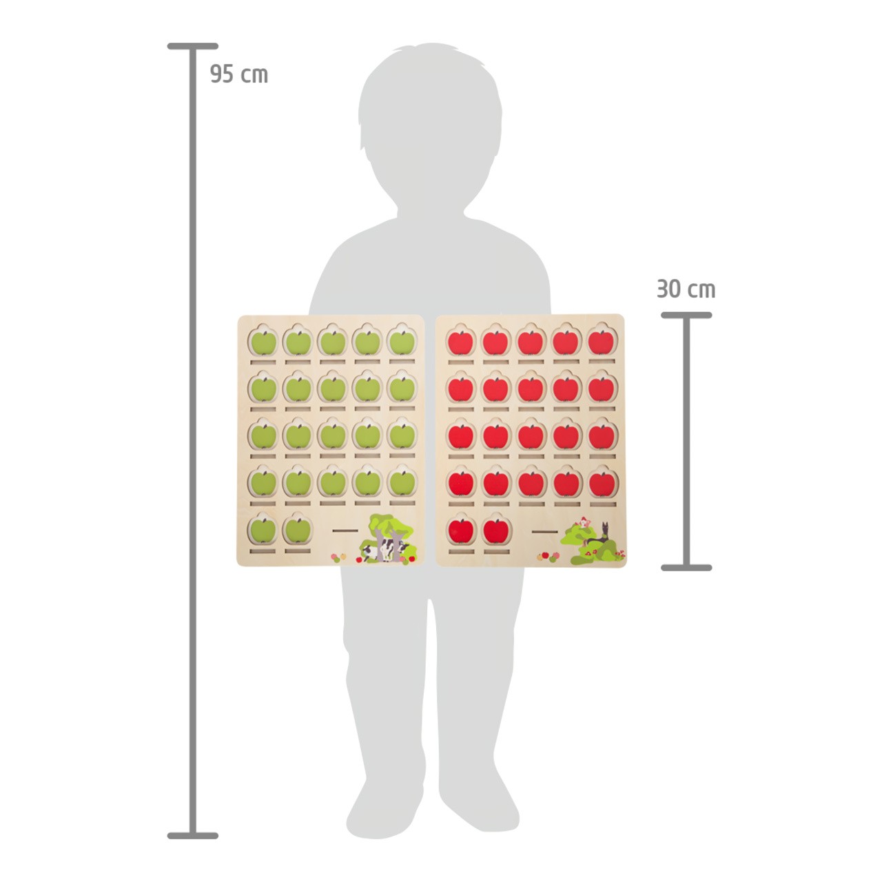 Hrací deska: 30x23x1 cm Rozměry jablka: 3,5x3x0,5 cm Materiál: dřevo, karton Věk: 4+ Celý popis