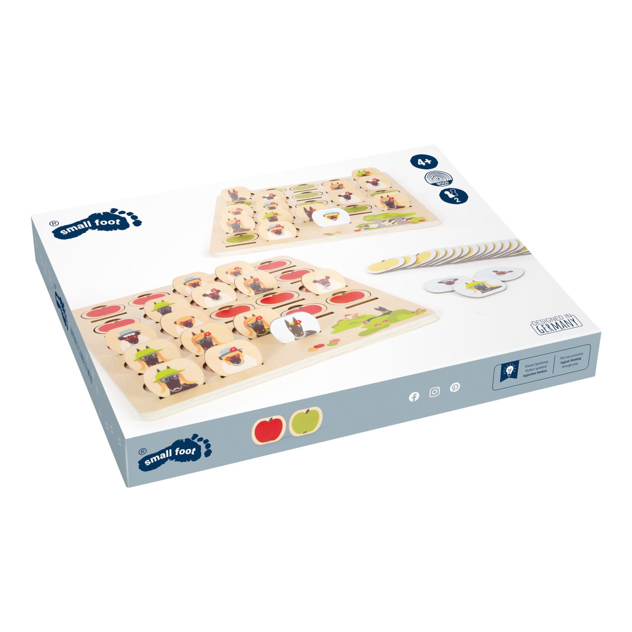 Kdo sebral jablka? S touto hrou může hádat celá rodina, budou vám stačit dobré pozorovací schopnosti, abyste co nejrychleji odhalili postavičku „4 přátelé“. Klasická hra je vyrobena z robustního dřeva a má design vhodný pro děti. V balení najdete 2 hrací desky, na které naskládáte ilustrované dílky, 22 kartonových kartiček s obrázky postaviček. 2 v 1, lze hrát také jako pexeso. Uloženo v kvalitním boxu.Kráva Olga a kohout Heinz se snaží zjistit, kdo ukradl jablka z louky, podezřelí se ale ukryli velmi dobře! Hra je vhodná pro úvod do světa podobností a rozdílností. Společenská hra má velmi jednoduchá pravidla a je vhodná pro lidi všeho věku. Pomáhá s rozvojem kombinačních dovedností a trénuje soustředěnost. Hlavní vlastnosti: populární hra s jednoduchými pravidly z robustního dřevadvě hrací desky, 22 kartonových kartiček2 v 1, lze také použít jako pexesokvalitní úložný boxpodporuje rozvoj kombinačních schopností a trénuje soustředěnostkompatibilní s ostatními hrami „4 přátelé“