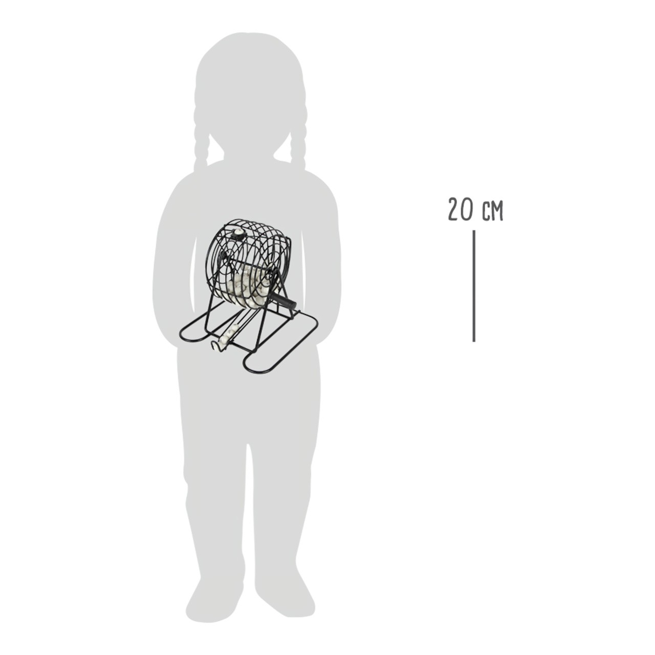 Klasická soutěžní hra "Bingo" s barevnými žetony, bílými kuličkami, plastovým zásobníkem a losovacím kovovým bubnem. Každý hráč si může vybrat svou vlastní barvu žetonů. Klika otáčí bubnem a jakmile se změní směr, první očíslovaná kulička spadne do přihrádky. Komu se podaří umístit správnou kombinaci jako první? Své štěstí si mohou zkusit jak malí, tak velcí hráči. Hlavní vlastnosti: obsahuje: barevné žetony, bílé kuličky, plastový zásobníklosovací buben je kovový děti se učí poznávat čísla