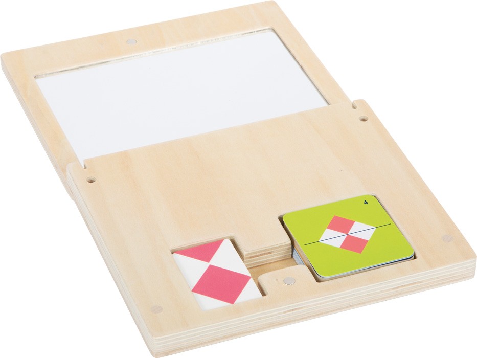 Objevte zrcadlové obrazy a symetrie hrou. Tato skvělá hra v praktické dřevěné krabičce je určena k intenzivnímu zkoumání symetrických obrazců a geometrických tvarů. Cílem dětského zrcadlového tangramu je umístit čtyři tvarové destičky z pevného dřeva před velké nerozbitné zrcadlo tak, aby umístěný obrazec spolu s obrazcem v zrcadle tvořil obrázek na příslušné kartě předlohy. Na 32 oboustranně potištěných šablonových kartách najdete úkoly se zvyšující se obtížností. Díky praktickému magnetickému uzávěru a kompaktním rozměrům je hra také ideálním společníkem a zábavou na cestách. Geometrické zrcadlo je fascinující hra a výuková zábava pro trénink prostorové a geometrické představivosti a pro rozpoznávání vzorů, tvarů, obrazců, jejich zrcadlových obrazů a symetrií. Vzdělávací hra, která zároveň hravou formou podporuje soustředění. Díky odolnému materiálu má hra na symetrii dlouhou životnost a lze ji používat několik let. Ideálně se doplňuje s dalšími vzdělávacími hrami z produktové řady "Educate". Hlavní vlastnosti: lze doplnit dalšími vzdělávacími hrami z produktové řady "Educate"baleno v praktické krabičce s magnetickým uzávěremhra vhodná k učení symetrických obrazců a geometrických tvarů32ks s oboustranně potištěnými kartamirůzně obtížné úlohy o symetriipodporuje soustředění