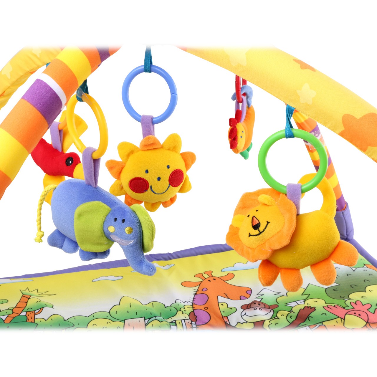 Kdo by nechtěl dovádět obklopený těmi nejroztomilejšími zvířátky! Příjemně měkká pestrobarevná podložka zdobená zvířecími motivy umožňuje nejmenším pohodlně ležet a hrát si s plyšovými hračkami pod klenbou z měkkých a pružných podpěr. Poutavé hračky různě chrastí, nebo pískají, přispívají tak k vývoji dětských smyslů a motoriky, motivují a postupně učí děti sedět. Jsou zavěšené na rozevíratelných kroužcích umožňujících jejich odepnutí, děti tak mohou mít své oblíbence vždy u sebe. Podložka je skladná a snadno rozložitelná, balená a dodáváná v praktické, snadno přesnosné plastové tašce. Hlavní vlastnosti: příjemně měkké, bezpečné a pohodlné provedení5 odnímatelných plyšových hračekzvukové efekty chrastění a pískánípraktické balení