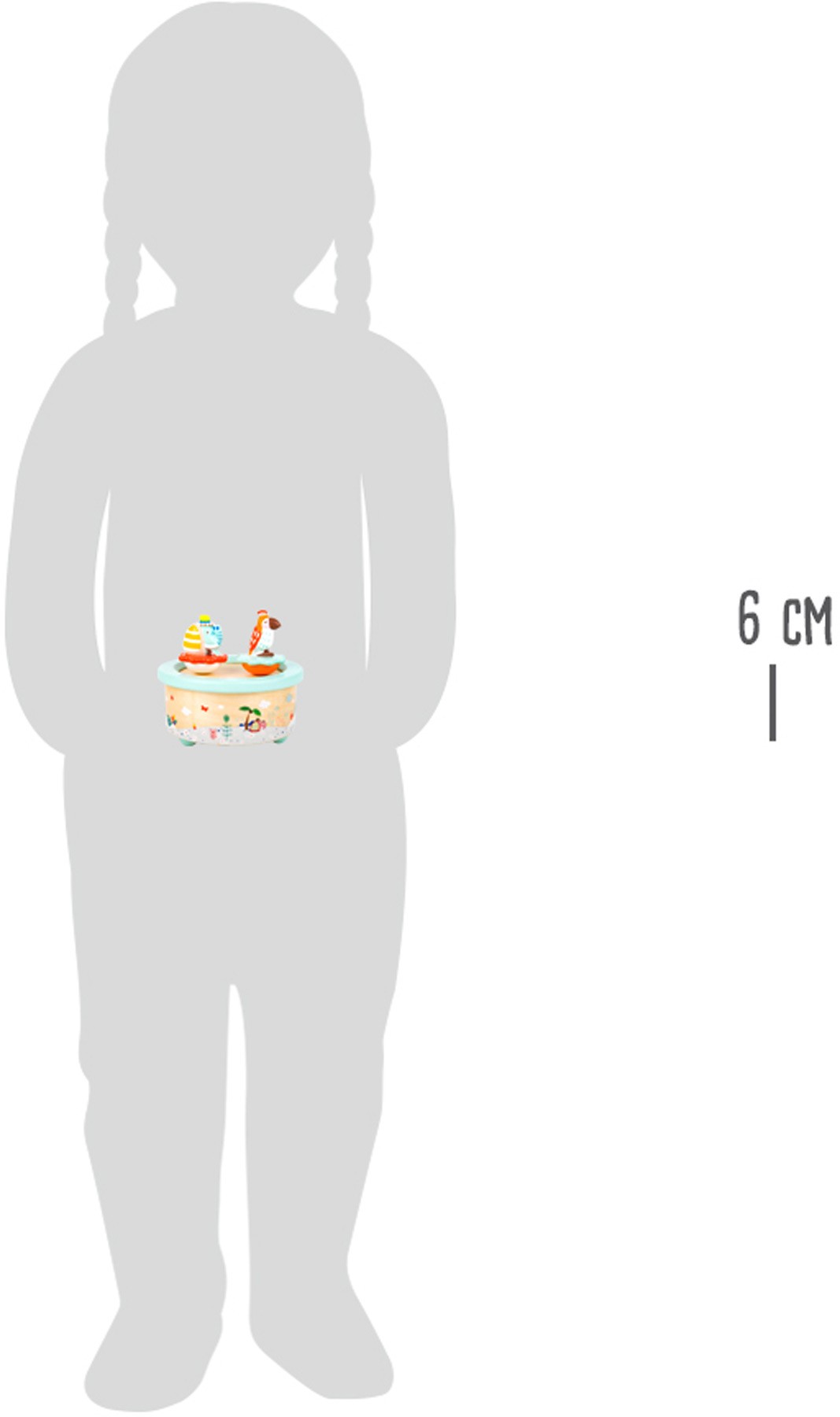 Rozměry: 6 cm, Ø12 cm Rozměry postavičky: 5,5 cm, Ø4 cm Věk: 3+ Materiál: dřevo, plast Celý popis