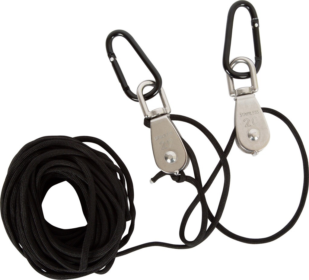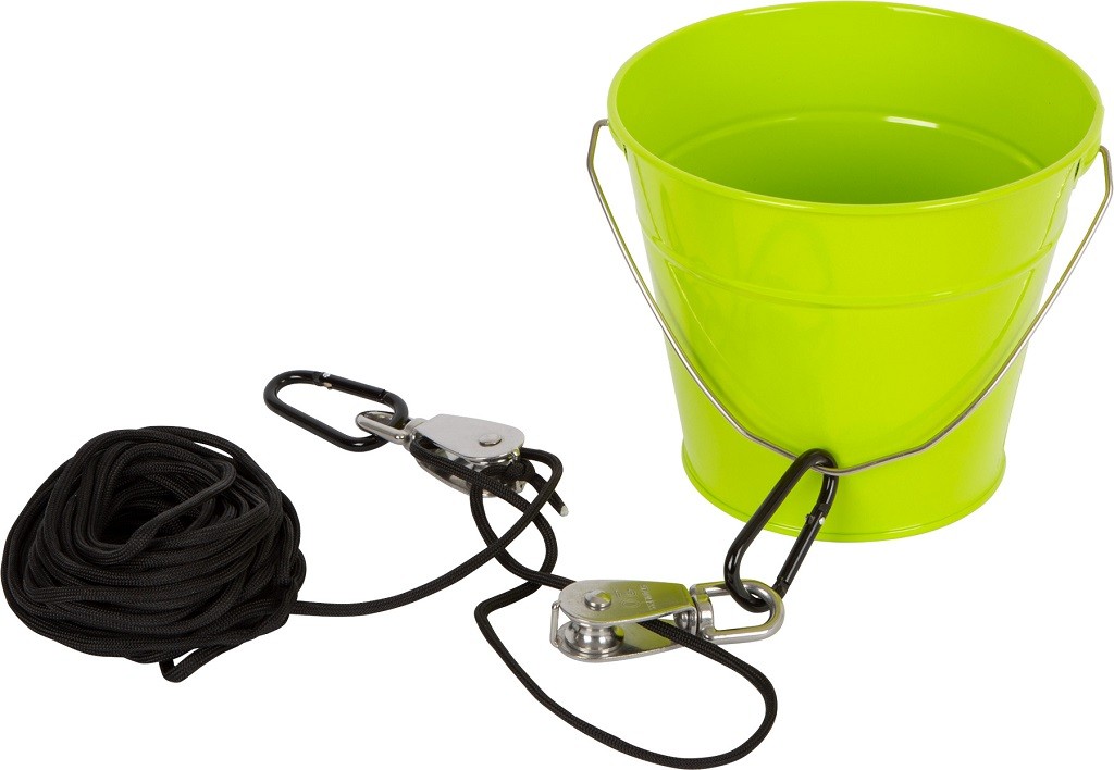 Do zahradního domečku, domu na stromě, na prolézačky nebo kamkoliv jinam! S tímto kladkostrojem se silným lanem a kovovým kyblíkem si mohou mladí dobrodruhové dopravit jakýkoliv náklad na tato zmíněná vyvýšená místa a zase zpět dolů. Děti tak nemusí opakovaně lézt nahoru a dolů. Je to zábavná hračka, která trénuje zručnost. Kovové ucho je navrženo tak, aby se karabina s lanem neposouvala. Děti se naučí, jak funguje kladkostroj a budou moci jednoduše hýbat těžkými náklady. Perfektní hračka na zahradu.