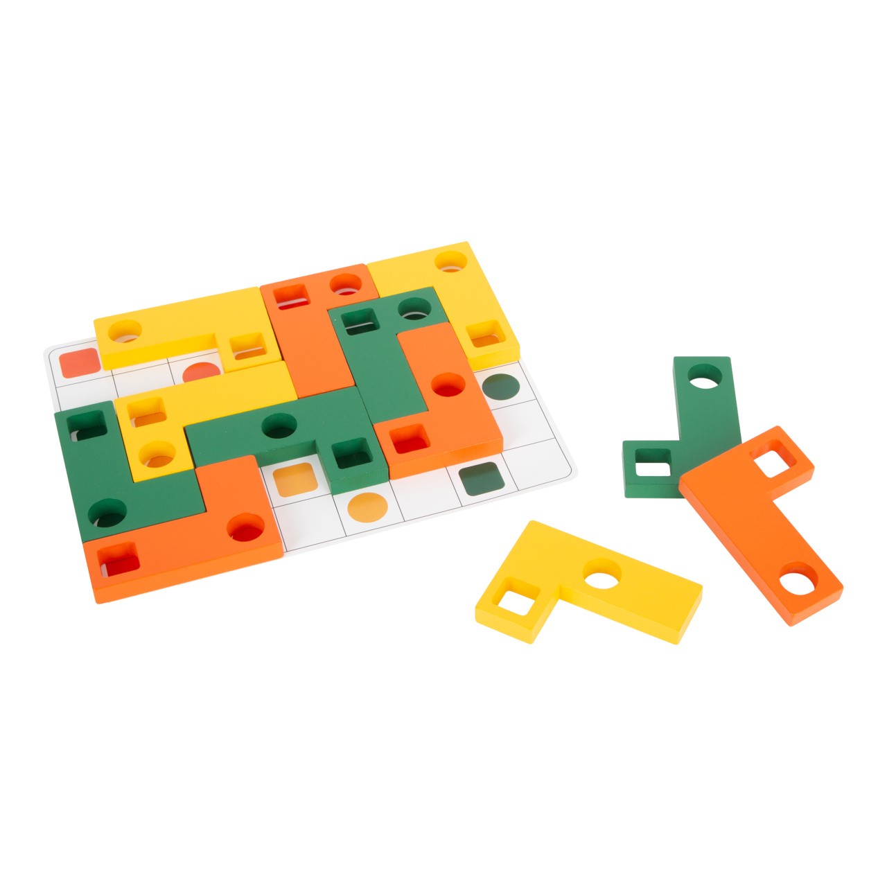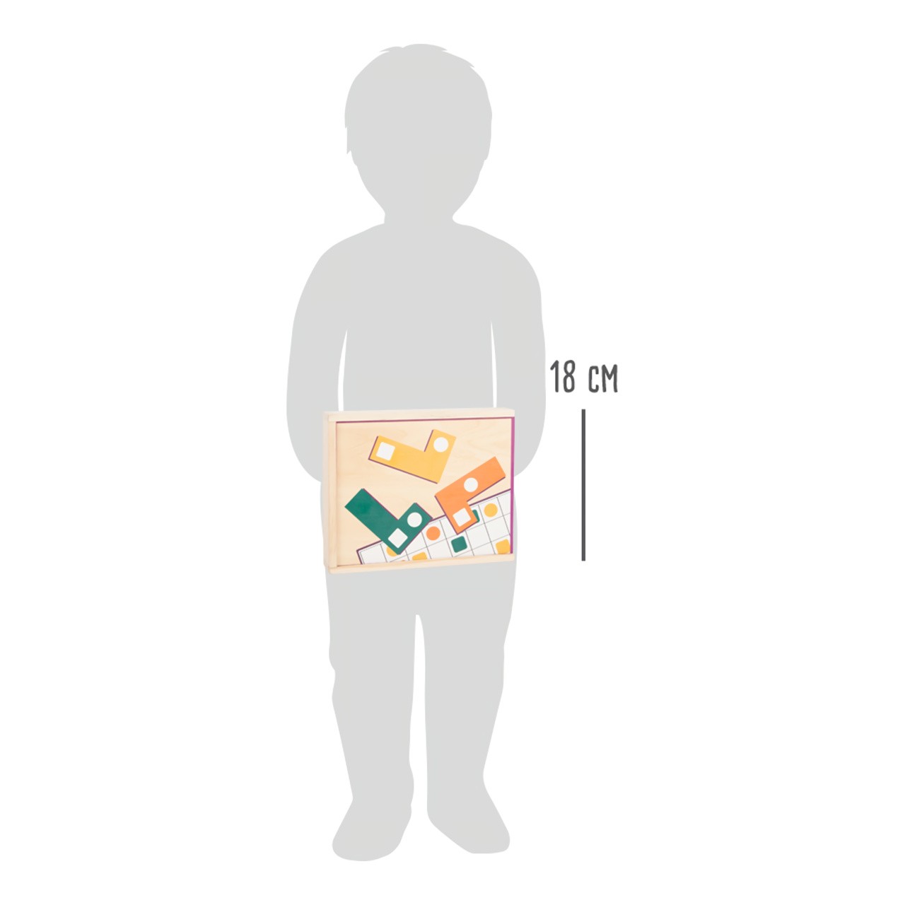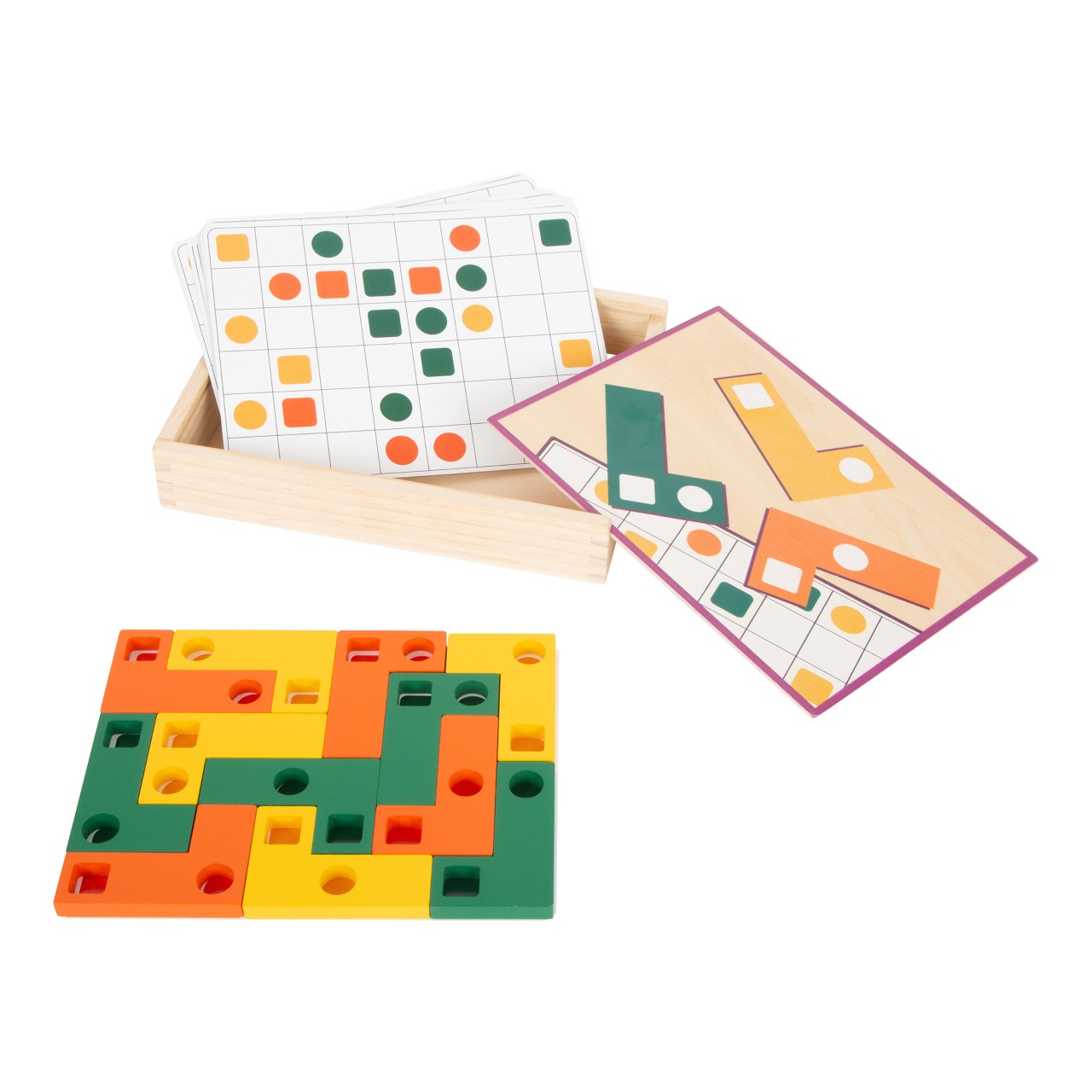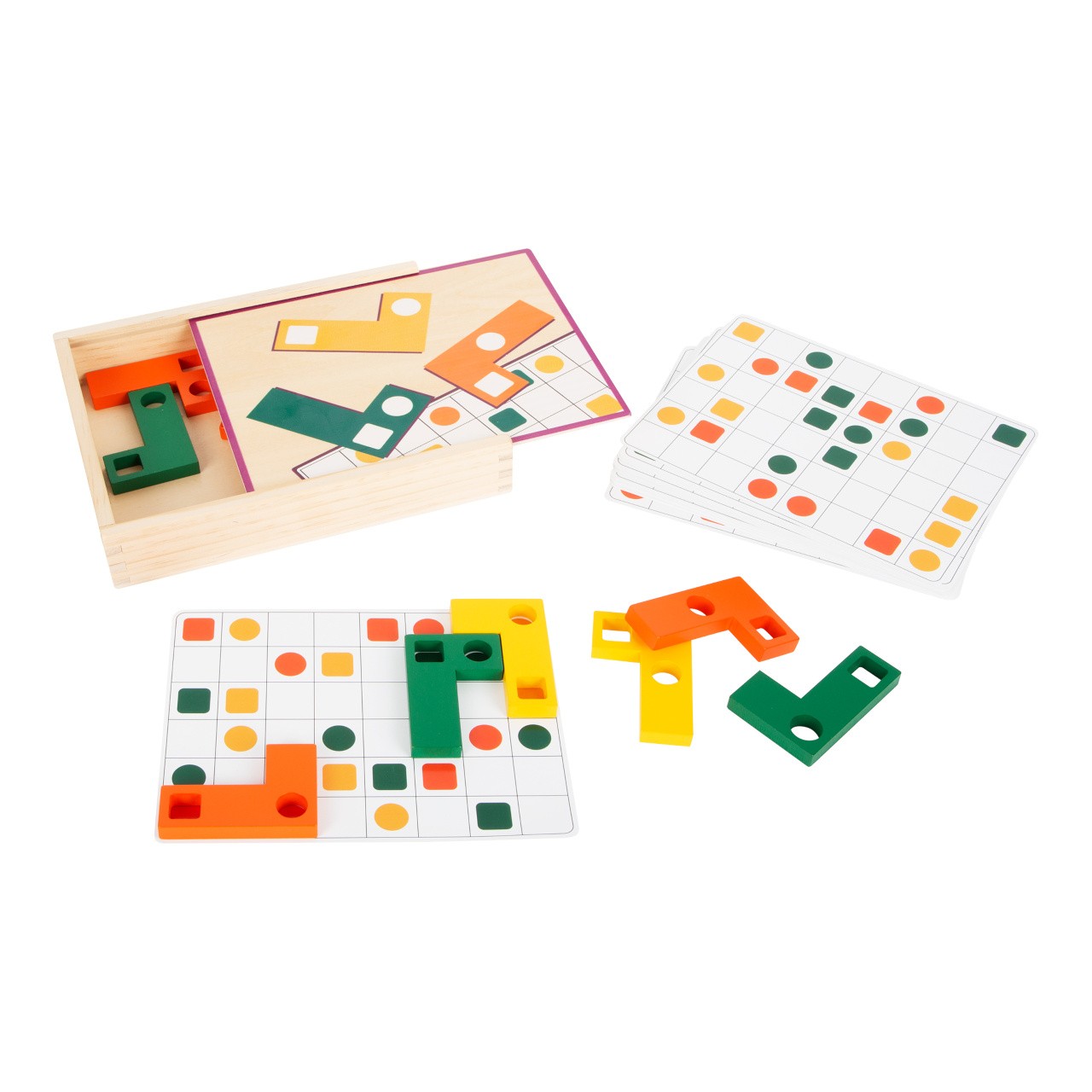 S tímto dřevěným logickým puzzle budete mít za úkol složit 12 dílků na herní kartičky, abyste správně vyplnili všechna místa. Herní dílky v sobě mají různé otvory, kterými je můžete správně uložit na již zmíněné herní kartičky. Toto puzzle trénuje prostorovou představivost, naučí děti poznávat barvy a tvary. Na patnácti kartičkách najdete třicet obrázků rozložení puzzle, podle kterých můžete skládat. Všechny dílky jsou bezpečně uloženy v dřevěné krabičce s posuvným víkem. Tato logická hra se hodí také k Small Foot Logické hře Mozaika (11729), Small Foot Hře logické matematické (11730), Small Foot Vzdělávací hře krmení zvířat (11731). Hlavní vlastnosti: 27 dílků celkempomáhá rozvíjet logiku, jemnou motoriku a představivostodolné dřevěné provedenípraktické balení