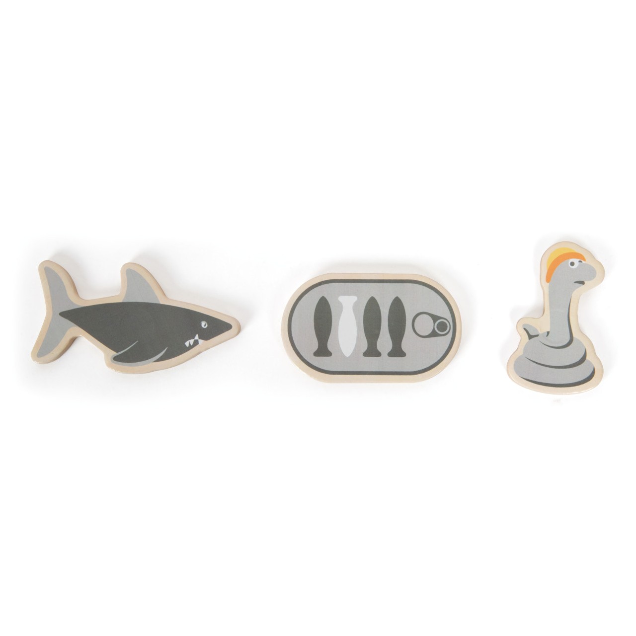 Vydejte se na moře rybařit s roztomilými zvířátky! Roztočte střelku kompasu, a vylosujte si tím mořského tvora, kterého máte ulovit. Chytáním magnetickou udičkou rozvíjejte jemnou motoriku a trpělivost, a to až se třemi přáteli, nebo v kruhu rodiny! Dílky hry jsou vyrobeny z odolné překližky a spolu s udičkami jsou uloženy v praktické, barevně ilustrované kartónové krabičce, která zároveň slouží jako hrací plocha. Hlavní vlastnosti:4 udičky, 16 herních dílků a 3 díly doplňkůpraktické balení