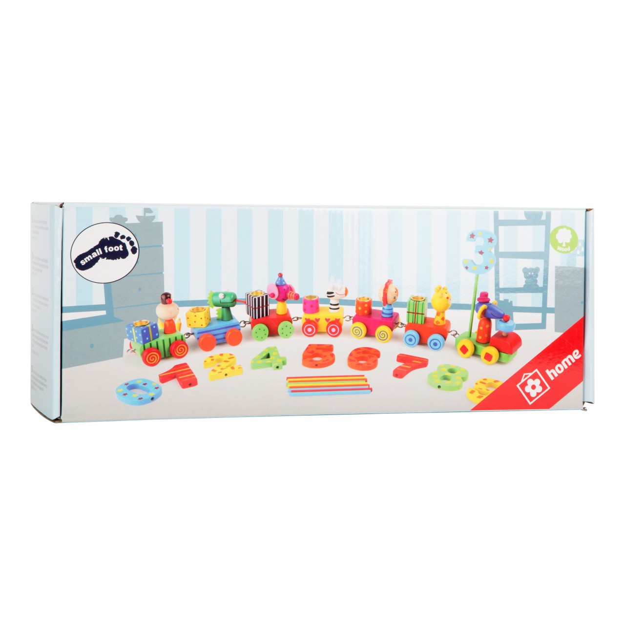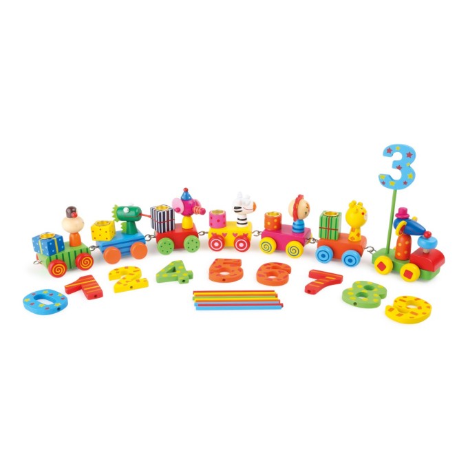 Barevný karavan se přesune k dalšímu narozeninovému dítěti a má na palubě zvířátka, která se prohánějí po narozeninovém stole jako vláček. Vpředu je myška s kloboučkem a za ní na tyčce číslo - věk dítěte. Každý z dřevěných vagónků má držák na svíčky, které může oslavenec sfouknout. Hlavní vlastnosti: součástí balení jsou čísla pestrobarevné provedení
