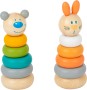 Hodně zvířecí zábavy pro malé ruce! Nasazovací zajíček a medvěd z barevného lakovaného dřeva inspirují děti ke hře. Dokáží poskládat kroužky do správného pořadí? Hračka trénuje motoriku, koordinaci ruka-oko a rozeznávání tvarů a velikostí. Pastelové barvy dodají nasazovací věži moderní look. Hračka z robustního dřeva se hodí i na cesty.
