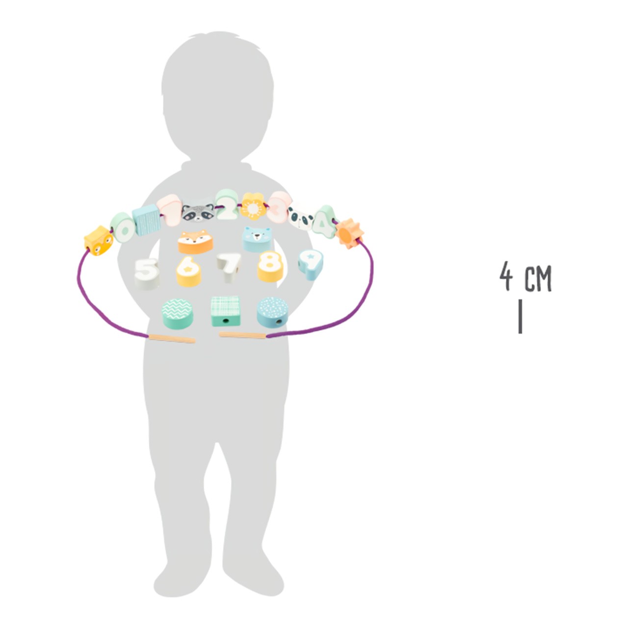 Rozměry dílku: cca 4x4x2 cm Délka šňůrky:100 cm, Ø 0,5 cm Věk: 2+ Materiál: dřevo Obsahuje 22 dílků Celý popis