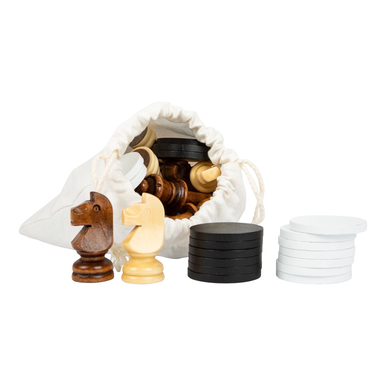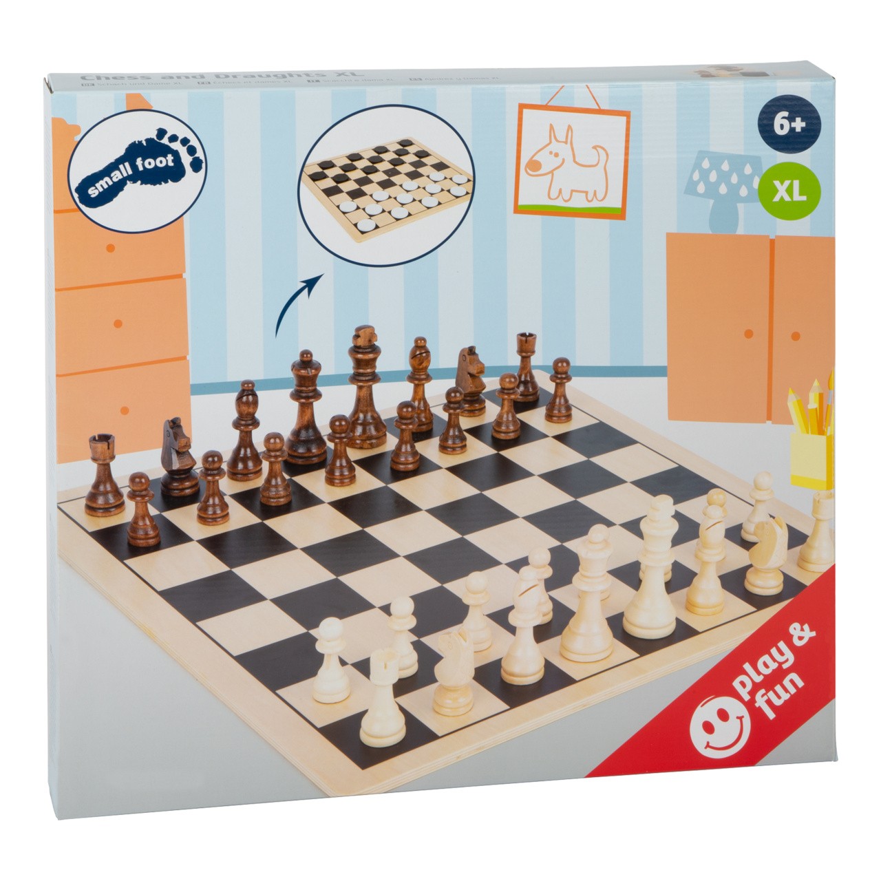 Při hře v šachy nebo dámu na velké dřevěné hrací desce je zapotřebí taktika, zručnost a promyšlené tahy. Mimořádně velké herní figurky usnadňují jejich umístění i hráčům s malýma nebo nejistýma rukama. Dodává se s látkovou taškou. Kdo udělá nejlepší tah? Tyto dvě extra velké klasické deskové hry slibují dvojnásobnou zábavu pro malé i velké. Dvě společenské hry, které vyžadují logické myšlení a soustředění a zároveň nabízejí maximální herní zábavu. Klasicky navržené šachové figurky a figurky na dámu lze bezpečně uložit do přiloženého látkového sáčku. Tato sada klasických her zaručuje velkou zábavu při hraní a nesmí chybět v žádném dětském pokoji. Hlavní vlastnosti: procvičuje zručnost, koncentraci a logické myšlenívelké herní figurky pro snadné uchopení2 v 1praktické balení