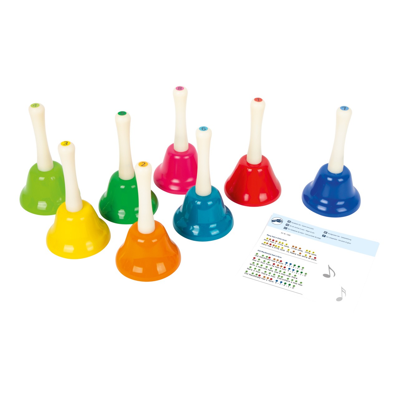 Toto je něco pro vaše uši! Těchto osm zvonečků nerozlišuje jen barva, ale také zvuk. Každý z nich je naladěn na jinou notu – C, D, E, F, G, A, H, C. V balení naleznete také noty s různými skladbami pro začátečníky a malé děti – noty jsou zaznačeny i barevně. Hudební set podporuje u dětí rozvoj rytmu, hudebního sluchu a také koordinace ruka-oko. V notách najdete písničky jako „Strýček Donald farmu měl“, „Rolničky“, „Třpyť se, hvězdičko“. Perfektní také do školek, prvních stupňů základních škol. Hlavní vlastnosti: jasné, výrazné barvy8 zvonků
