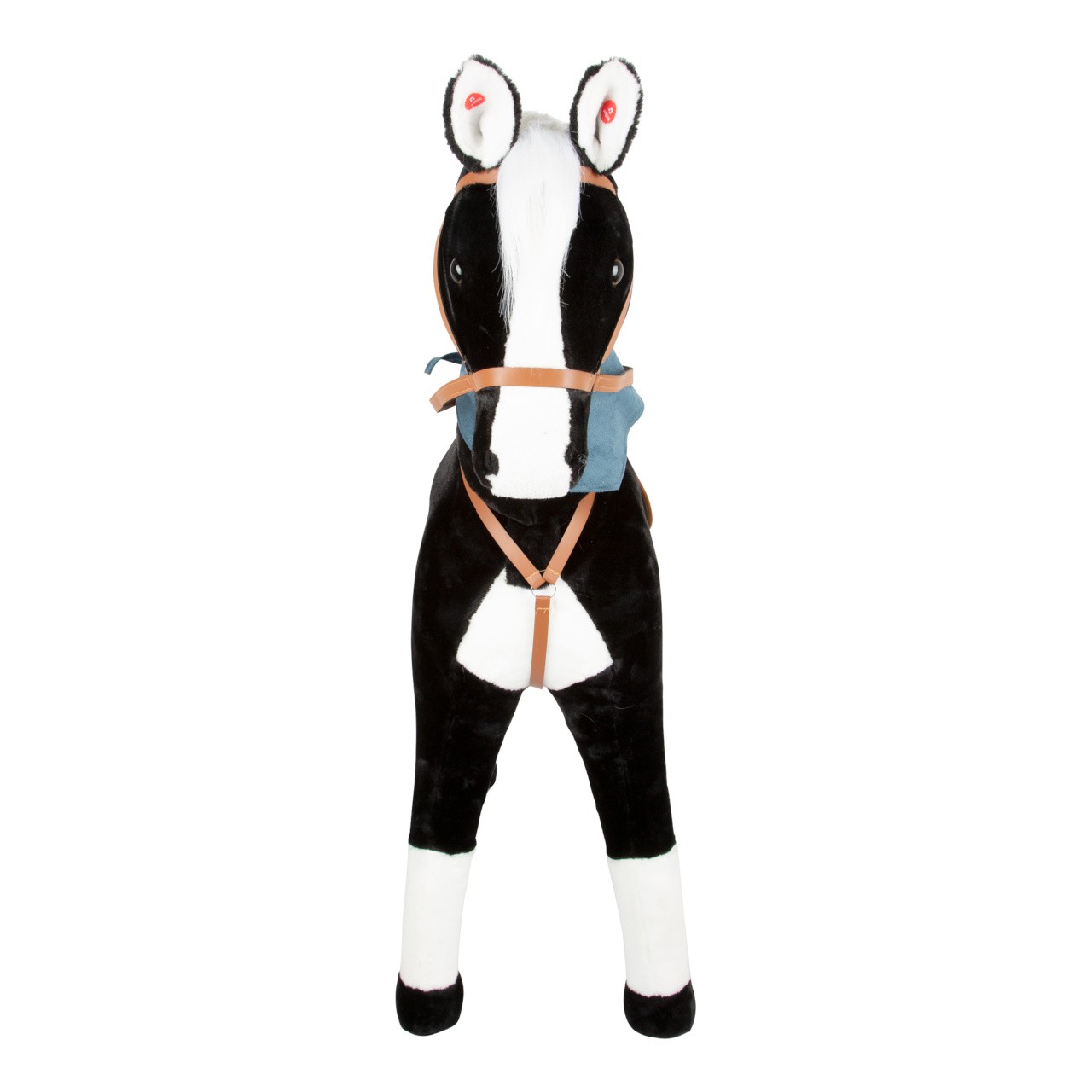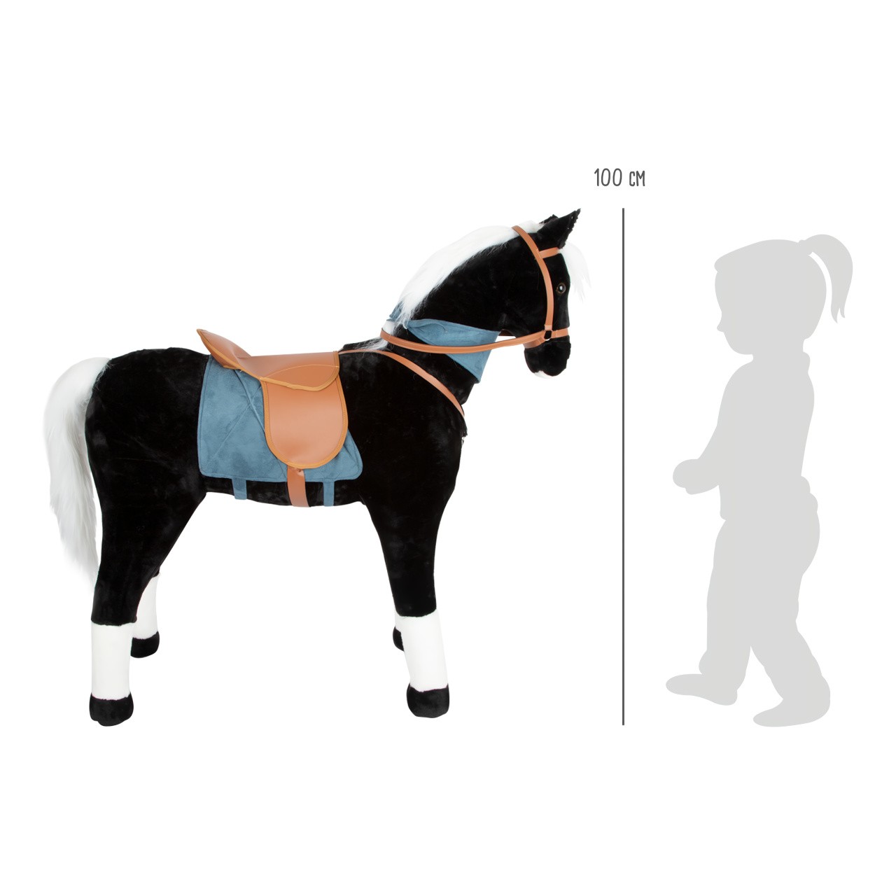 Vzhůru na další dobrodružství! Tento černý jezdecký kůň s čalouněným odnímatelným sedlem a roztomilým šátkem okouzlí každého jezdce. Když stisknete ucho, zazní veselé řehtání. Pro děti je tento velký plyšový kůň skvělým společníkem v dětském pokoji! Baterie nejsou součástí balení. Výrobek vyžaduje montáž, dodáváno s obrázkovým návodem k sestavení. Hlavní vlastnosti: podporuje pohybovou aktivitu, rovnováhu a koordinacivýška sedu 75 cmhračka se zvukem - koňské řehtání (2xAA baterie nejsou součástí balení)