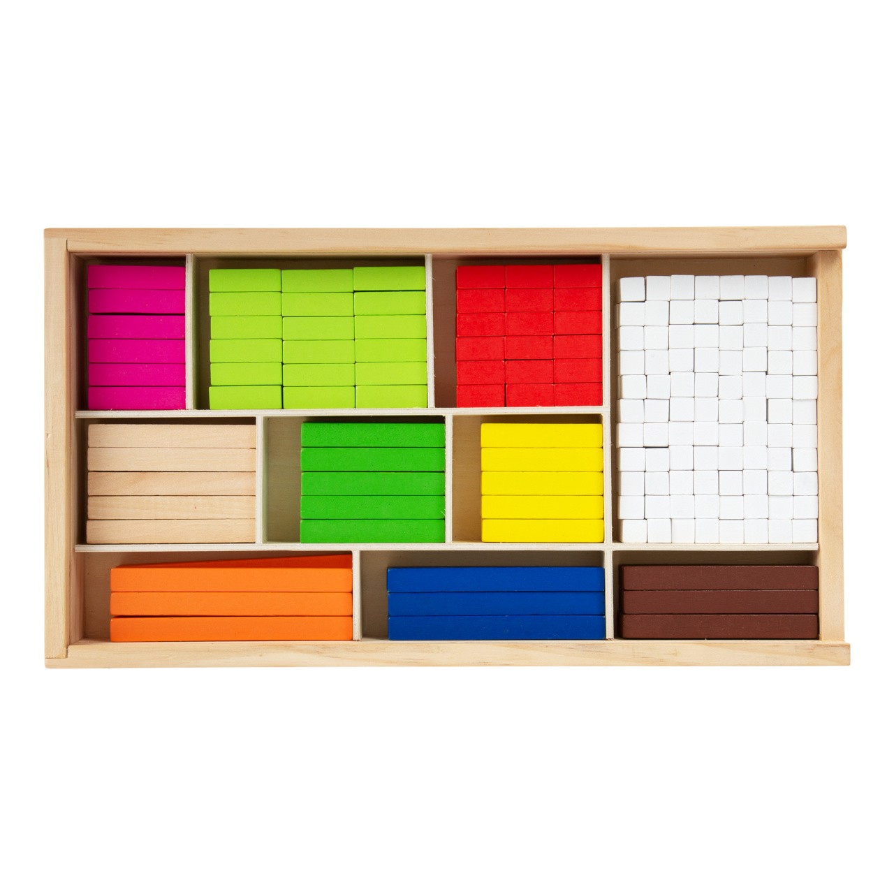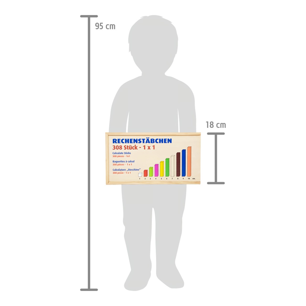 Je deset větší než tři? Tyto všestranné matematické tyčinky poskytnou dětem první porozumění číslům a rychle a názorně je podpoří při prvních pokusech o matematické rovnice. Různé délky tyčinek slouží jako orientační pomůcka. Děti předškolního věku získají základní matematické dovednosti při počítání, porovnávání a třídění tyčinek. Tyto tyčinky jsou ideální společníci pro matematické profesionály všech věkových kategorií. Trénují představivost a logické myšlení a zároveň předávají pochopení velikostí a barev. Všechny tyčinky lze po ukončení učení roztřídit a uložit do přiložené dřevěné krabice s posuvným víkem.  Hlavní vlastnosti: 308 ks víceúčelových matematických tyčinek jako ideální úvod do světa číselpočítání, porovnávání a třídění přináší dítěti první základní matematické dovednostibaleno v dřevěné krabici s posuvným víkem