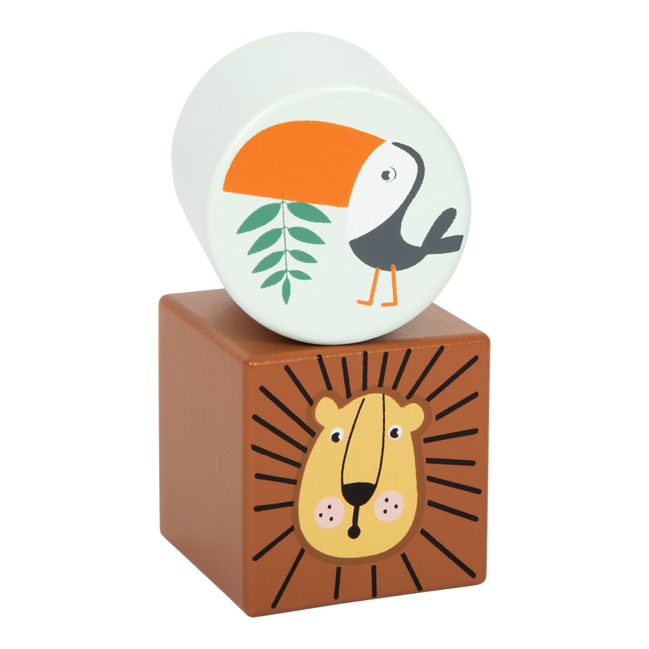 Obklopte se džunglí tvarů, barev a zvuků! Každá z kostek nabízí originální atrakci, která podněcuje dětskou zvědavost. Část sady je interaktivní, můžete se tak například podívat na svět složeným okem, či zrcátkem, nebo si hrát s rolničkami a chrastítky. Rozmanitými tvary, příjemnými odstíny a motivy divokých zvířátek mohou kostky dopomoci stimulovat představivost k roztodivným stavbám, nebo i příběhům. Jsou dřevěné, odolné a svou velikostí přizpůsobené ručkám nejmenších.   Hlavní vlastnosti:12 kostekzrakové, sluchové a hmatové atrakceodolné dřevěné provedení