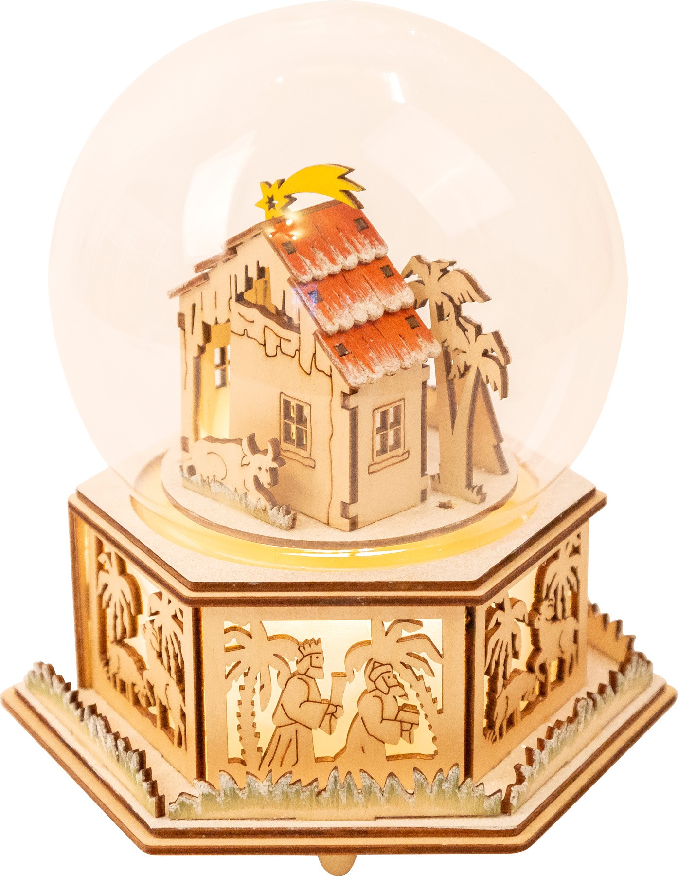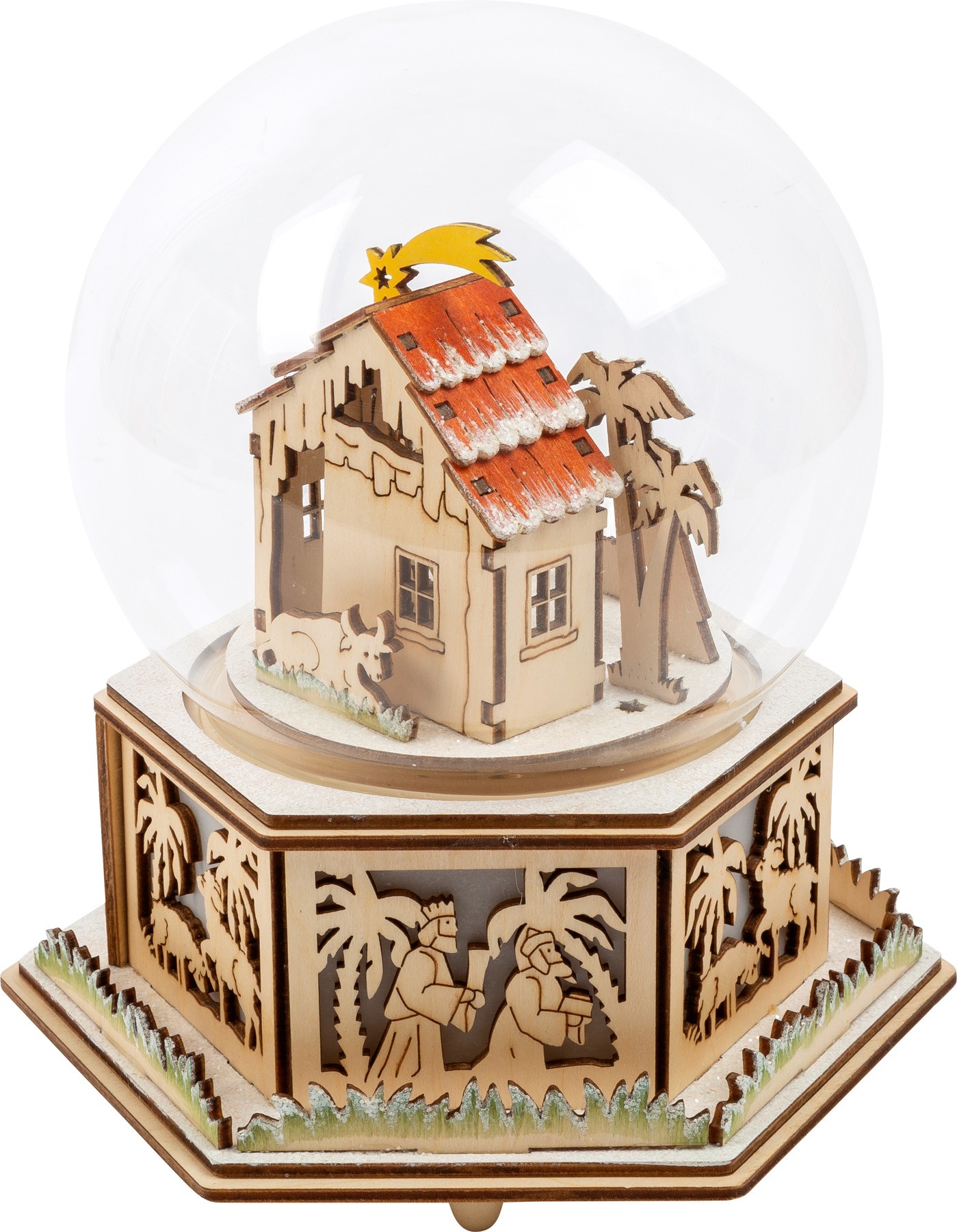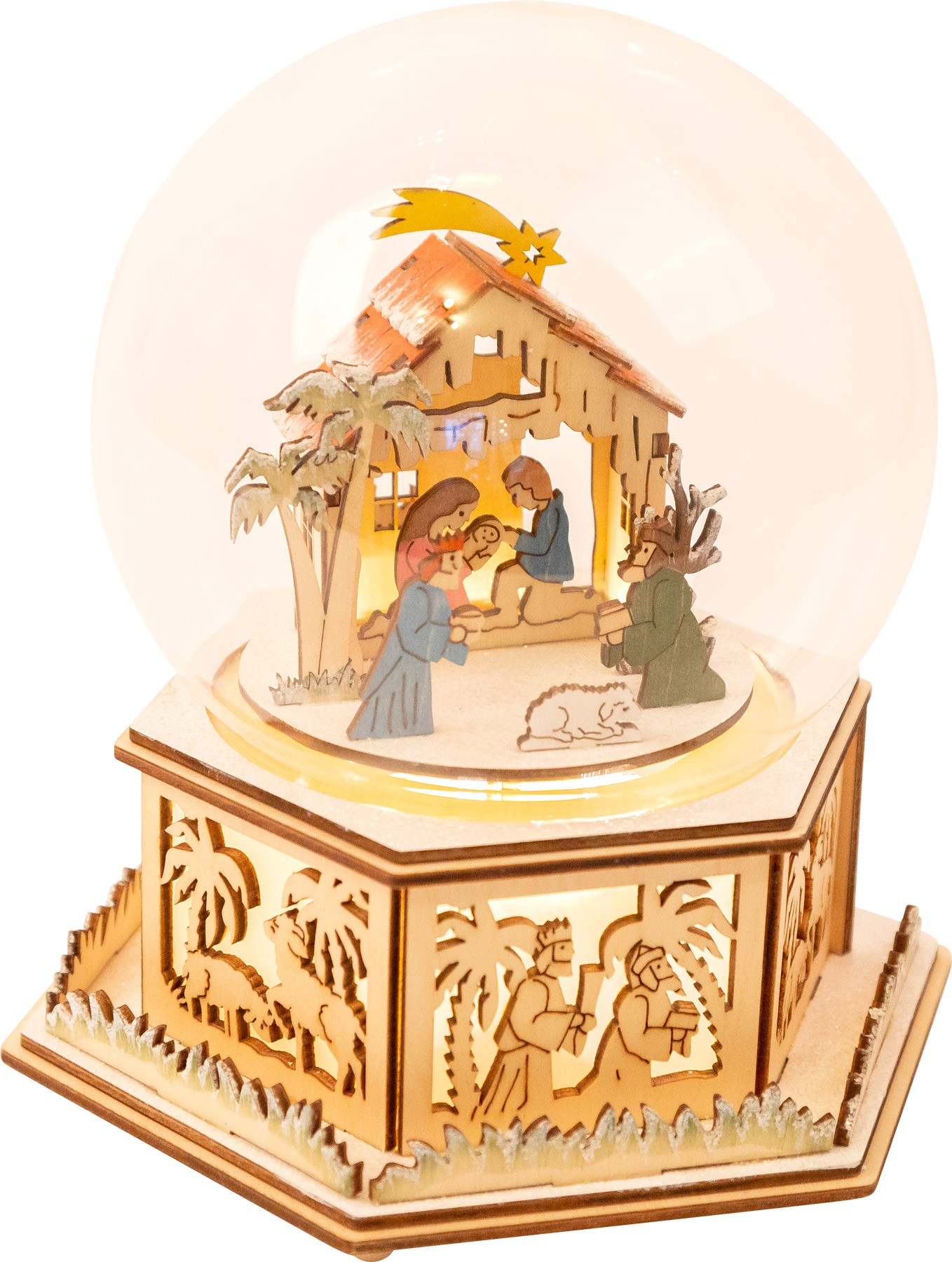 Tato krásná světelná dekorace je vyrobena z kvalitního dřeva. Hudební skříňka s vánočním motivem betlému hraje melodii "Tichá noc". Zatímco hraje hudba, rozsvícená sváteční koule vydává tlumené světlo. Baterie nejsou součástí balení.  Hlavní vlastnosti: sváteční koule a hrací skříňka v jednom přidá Vánocům příjemnou atmosférudrobné,jemně vyřezávané detailyodpovídá evropské bezbečnostní normě