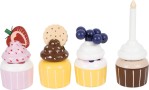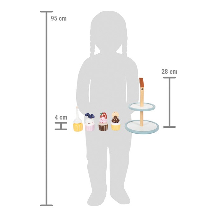 Lahůdky do dětské kuchyňky. Tento stojan se čtyřmi košíčky zve malé cukráře k aktivnímu hraní a prezentování lahodných muffinů. Stojan má dvě patra, které slouží k vystavení cukrovinek ve vrstvách. Systém kombinovatelných podstavců a krémových vršků umožňuje široké možnosti kombinací díky integrovaným magnetům. Sada je doplněna o dvojitou sušenku, jahodový řez, borůvky a narozeninovou svíčku, kterou lze dorty ozdobit. To povzbudí chuť na čaje a kávové večírky s panenkami, medvídky atd. Komu se z toho pohledu neslévají sliny? Ideální doplněk do kuchyňky a obchodu s potravinami. Detaily, jako je držadlo z tmavě hnědé imitace kůže, integrované magnety a moderní, decentní skandinávské barvy dělají ze sady na hraní rolí vysoce kvalitní a stylovou upoutávku do dětského pokoje. Hlavní vlastnosti: decentní skandinávské barvy inspiruje a podněcuje ke konverzaci1 stojan, 4 muffiny, 4 polevy, 1 svíčka, 1 sušenka, 1 jahoda, 1 borůvka
