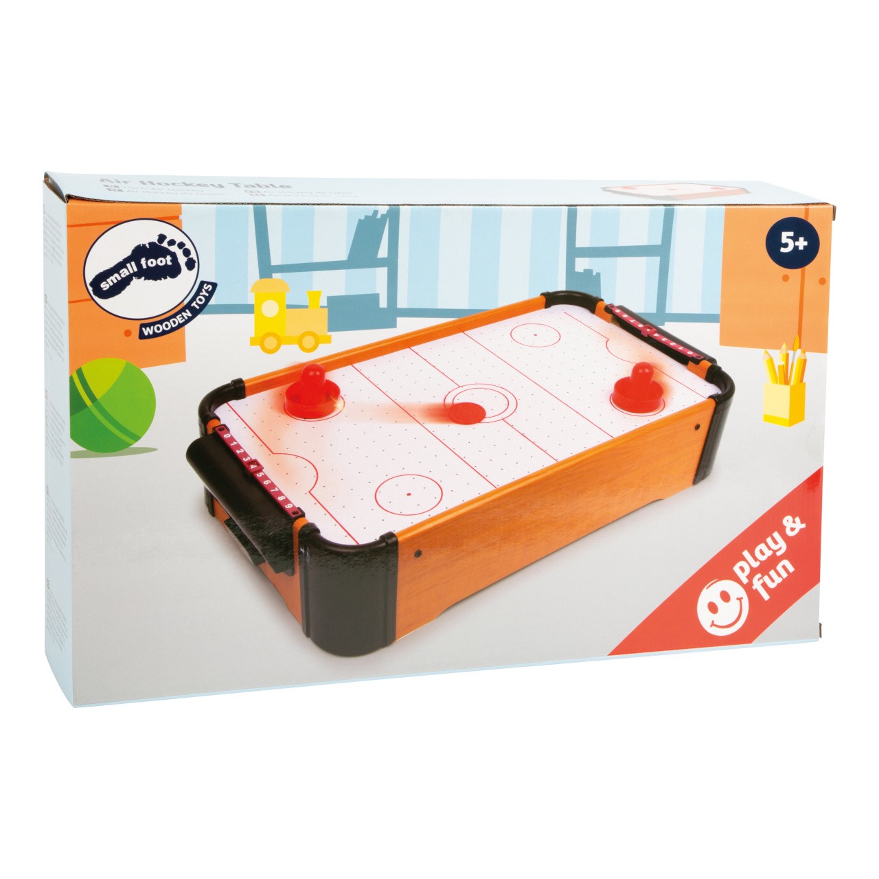 Tento vzdušný hokej je rychlá hra, kterou můžete hrát na malé ploše. Větrák je napájen osmi AA bateriemi, které puk zvednou a ten díky tomu může lítat po herní zóně rychle jako blesk. Tato hra perfektně trénuje motoriku a koordinaci ruka-oko. Stolní Air Hockey můžete postavit kamkoliv a po dohrání jej jednoduše vrátíte zpět do skříně, abyste ušetřili místo. Hlavní vlastnosti: skvělá hra pro soutěživé dvojicetrénuje motoriku a koordinaci ruka-okokompaktní rozměry
