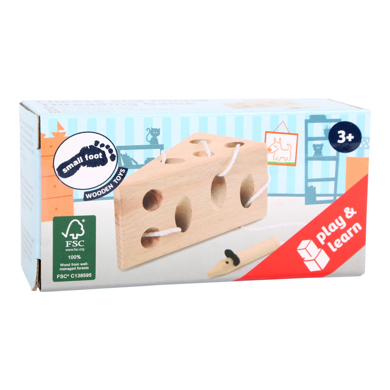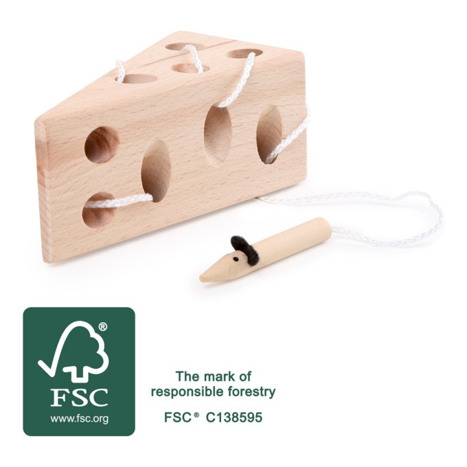 Kdo se to prokousal sýrem? Přeci malá myška! Tato krásná provlékací hra je vyrobena z přírodního lakovaného a 100% FSC certifikovaného bukového dřeva. Trénuje motoriku a trpělivost. S trochou zručnosti provlečete myšku hravě celým sýrem, procvičíte si prsty a jemnou motoriku. Hlavní vlastnosti: trénuje motoriku, zručnost100% FSC dřevo     Značka a certifikát FSC® (Forest Stewardship Council) zaručuje, že dřevo, ze kterého byl produkt vyroben, nebylo vytěženo nelegálně a pochází z lesů obhospodařovaných šetrným či přírodě blízkým způsobem, ve kterém jsou dodržovány přísné environmentální a sociální požadavky. Značka FSC® na výrobku znamená, že svým nákupem pomáháte chránit lesy a podporujete šetrné, odpovědné či přírodě blízké hospodaření, díky kterému jsou naše lesy stabilnější, zdravější, mají přirozenou druhovou skladbu a lépe odolávají negativním následkům klimatických změn.