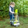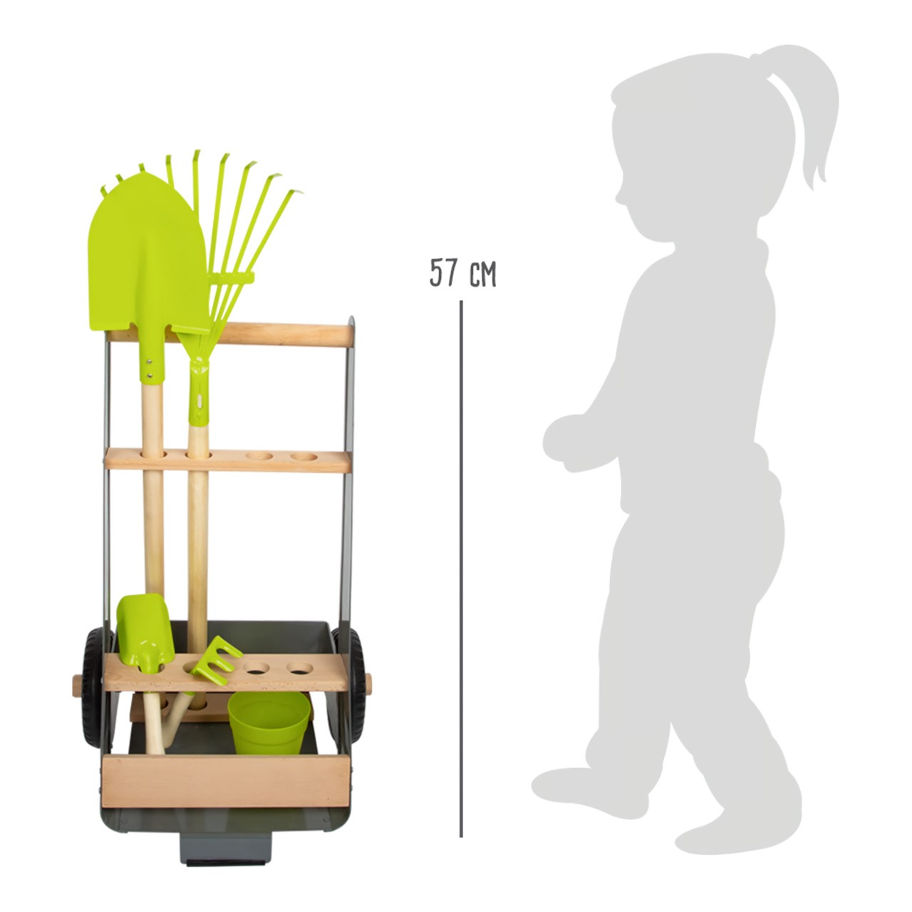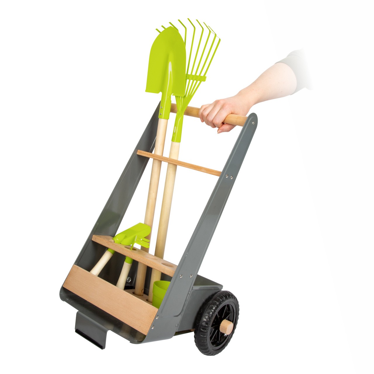 Mladí nadšení zahradníci a zahradnice teď mohou začít pracovat na svém vysněném záhonku. Stabilní vozík vyrobený z bukového dřeva a kovu lze jednoduše tlačit či tahat po zahradě, má k tomu totiž stavěná kola. Dobře promyšlený design myslel na úložný prostor, vzhled i bezpečnost. Hrábě, rýč i lopata mohou být uloženy tak, aby směřovaly pryč od hlavy dítěte. Hlavní vlastnosti: atraktivní a robustní mix materiálů – buku a kovulehký přesun díky pevným a velkým kolůmosm otvorů pro uložení zahradního náčiníjednoduše omyvatelnýkovové nožičky opatřeny gumou pro lepší stabilituk doplňkům vozíku patří rýč, hrábě, plastový květináč, lopatka a hrabky