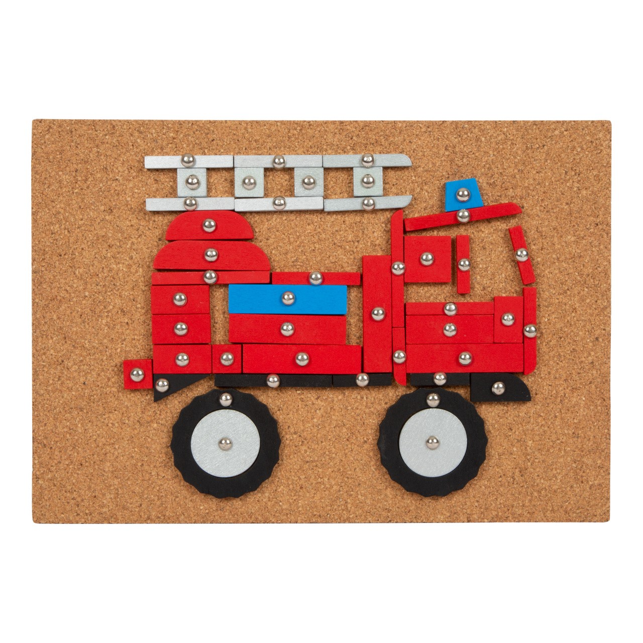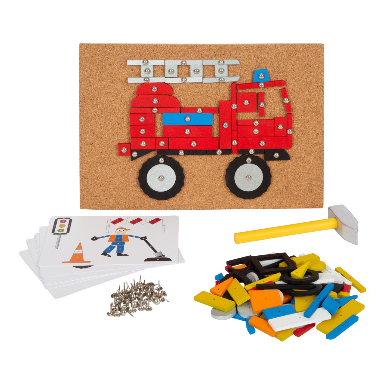 Obsáhlá kreativní hrací sada s tematikou dopravy! V balení najdete korkovou podložku, dřevěné kladivo, připínáčky a mnoho dílků z laminovaného dřeva v rozdílných tvarech a barvách. V krabici, která je vhodná i na uschování této hračky, najdete šest obrázkových předloh.Klasická zatloukací hra v moderních barvách a nesmrtelném designu, s kterou si děti mohou vytvořit obrázky dopravních prostředků, stavebních strojů, aj. Mohou se řídit obrázkovými předlohami nebo tvořit dle vlastní představivosti. Hračka pomáhá s rozvojem kreativity, trénuje zručnost, zlepšuje koordinaci ruka-oko a rozeznávání barev a tvarů. Zatloukací sada je vhodná pro děti malé i větší. Hlavní vlastnosti: zatloukací hra s rozsáhlým výběrem motivůdřevěné kladívko, připínáčky, korková podložkadílky různých tvarů a barevděti si procvičí motoriku a rozeznávání tvarů a barevmoderní barevné schémazlepšuje zručnost a koordinaci ruka-oko