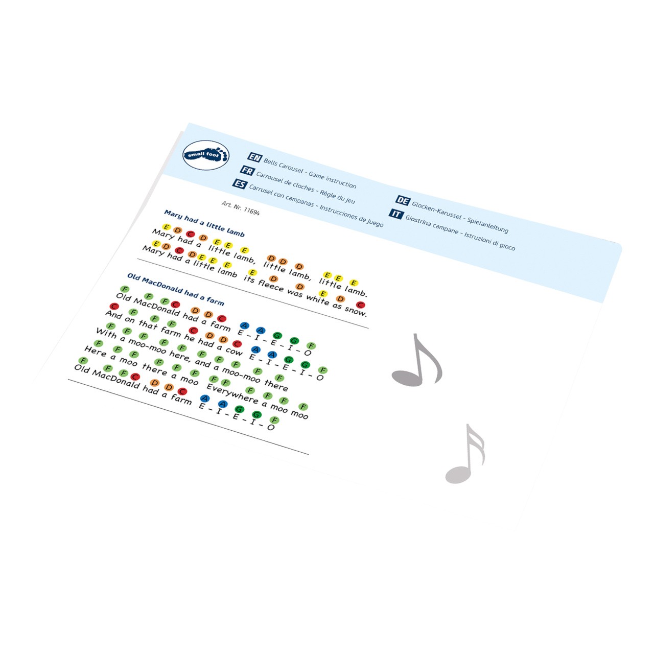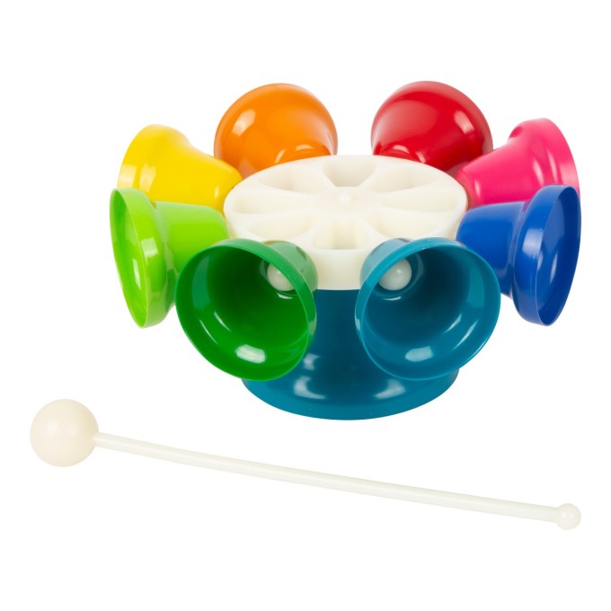 Jiná barva, jiný zvuk! Tento kolotoč má osm barevných zvonečků, každý z nich je naladěn na jinou notu – C, D, E, F, G, A, H, C. Zvoneček můžete držet v ruce nebo jej nechat na stojanu. Paličkou můžete hrát podobně jako na xylofon. V balení naleznete také noty s 8 různými skladbami pro začátečníky a malé děti – noty jsou zaznačeny i barevně. Hudební set podporuje u dětí rozvoj rytmu, hudebního sluchu a také koordinace ruka-oko. V notách najdete písničky jako „Strýček Donald farmu měl“, „Rolničky“, „Třpyť se, hvězdičko“. Perfektní také do školek, prvních stupňů základních škol. Hlavní vlastnosti: osm barevných zvonečků = osm tónůrozvíjí talent dětí, cit pro rytmus a melodiisoučástí balení noty s osmi písněmi