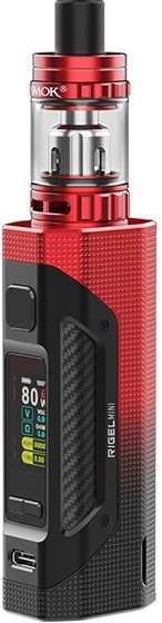 Není určeno pro náplně obsahující nikotin! Smoktech Rigel Mini je vynikající grip s maximálním výkonem až 80W napájený jednou baterií typu 18650, která je uložena pod zadním magnetickým krytem. Odlehčené tělo gripu ze slitiny zinku je pokryto pogumovanou vrstvou s bočními panely z uhlíkových vláken. Na přední straně gripu je umístěn 0,96 palcový dotykový displej se snadným ovládáním. Mezi jeho další přednosti patří ochrana proti zkratu a přehřátí, historie vapingu, či 8-mi vteřinová ochrana žhavení. Výrobce tento grip osadil clearomizerem TFV9 Mini, který spolupracuje se žhavícími hlavami typu V9 a TFV8 Baby. Využívá systém horního plnění - po odsunutí vrchní části plníte liquid otvorem přímo do těla clearomizeru o objemu 3ml. Celý clearomizer je plně rozebíratelný = snadná údržba. Regulace přívodu vzduchu pro nastavení optimální kouřivosti se nachází ve spodní části.