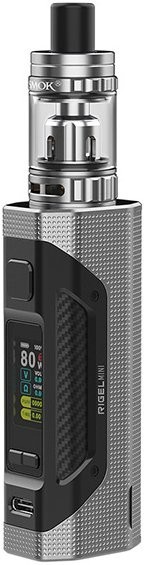 Není určeno pro náplně obsahující nikotin! Smoktech Rigel Mini je vynikající grip s maximálním výkonem až 80W napájený jednou baterií typu 18650, která je uložena pod zadním magnetickým krytem. Odlehčené tělo gripu ze slitiny zinku je pokryto pogumovanou vrstvou s bočními panely z uhlíkových vláken. Na přední straně gripu je umístěn 0,96 palcový dotykový displej se snadným ovládáním. Mezi jeho další přednosti patří ochrana proti zkratu a přehřátí, historie vapingu, či 8-mi vteřinová ochrana žhavení. Výrobce tento grip osadil clearomizerem TFV9 Mini, který spolupracuje se žhavícími hlavami typu V9 a TFV8 Baby. Využívá systém horního plnění - po odsunutí vrchní části plníte liquid otvorem přímo do těla clearomizeru o objemu 3ml. Celý clearomizer je plně rozebíratelný = snadná údržba. Regulace přívodu vzduchu pro nastavení optimální kouřivosti se nachází ve spodní části.