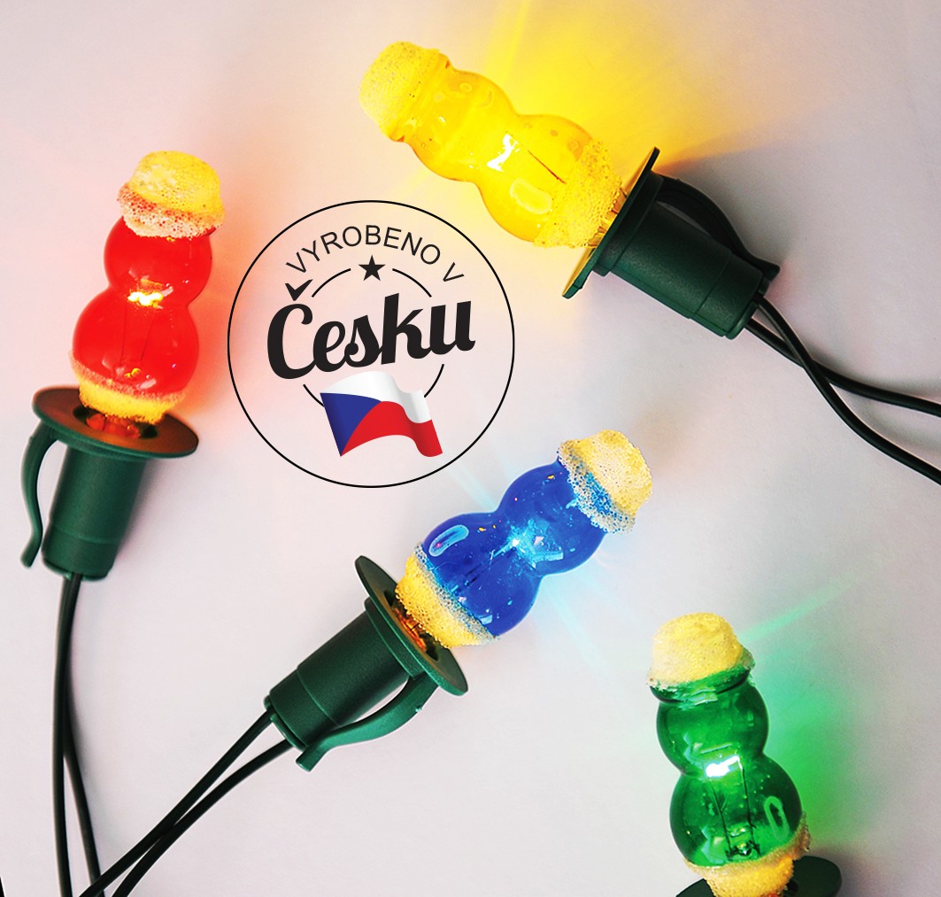 Tradiční osvětlovací souprava se skleněnými žárovkami tvaru SNĚHULÁK.Česká ruční výroba, navazujicí na výrobu vánočních souprav Heliand od roku 1946 v Piešťanech.Určena do střední velikosti stromků.Uchycení na větvičky pérkem.